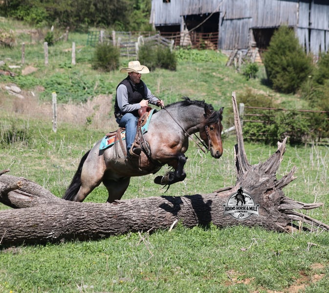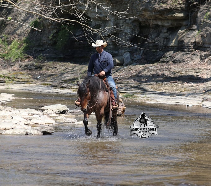 Go to visit our website for more pics and video link at www.AdamsHorseAndMuleCo.com AHAMC has been in the horse business and sold horses over the internet since 2005. We have a long track record of success with hundreds of happy customers. We work hard to match riders with the correct horses and specialize in beginner safe, family friendly horses that have been used and checked out by our family! We can set up transportation anywhere in the US and look forward to working with you. Clover is just as sweet as his name suggest! He is an awesome looking 15.2h, Bay Roan Draftcross gelding! He is 5 years old and is a sturdy built horse. Clover came from the same breeding farm that a lot of our draftcrosses come from and with that farm we find the constant quiet, gentle, laid back temperament that makes them such good family safe trail horses! Clover is no exception to that statement as he is a super quiet, gentle, laid back type of horse that is going to suit any rider and help build your confidence. Not to mention he is very friendly as well! Clover can do a variety of things from pulling carriages, to ranch work or trail rides. Clover has been on camping trips, been ridden in several states and has been ridden by all ages of beginners. We took him on a week long trip to Texas and Missouri back in March as an extra for some of our friends (total beginners!!!) to ride around an exotic ranch. Clover saw Bison, Water Buffalo, Emu, Ostriches, Camels, Nilgai, Blesbok, Ibex, Rusa, Corsican, Zebra, and even got chased by a herd of Wildebeest(they are mean little critters!) We even rode on the beach of the Barzos River and across it as well. But nothing phased Clover! When out on the ranch or going down the trails, he will cross creeks, ditches, logs and navigate rough rocky areas. He is safe in traffic safe whether that be trucks or cars. He’s been ridden around the ranch, checked cows and rode fences. Clover moves very smoothly, as he has a nice jog, his lope is smooth as well and he lopes nice circles on a loose rein! He has been ridden English and goes over the jumps with ease. If you want a sweet guy who will be your best friend, Clover will fit the bill! Feel free to call Eric 606-308-2461 with any questions!