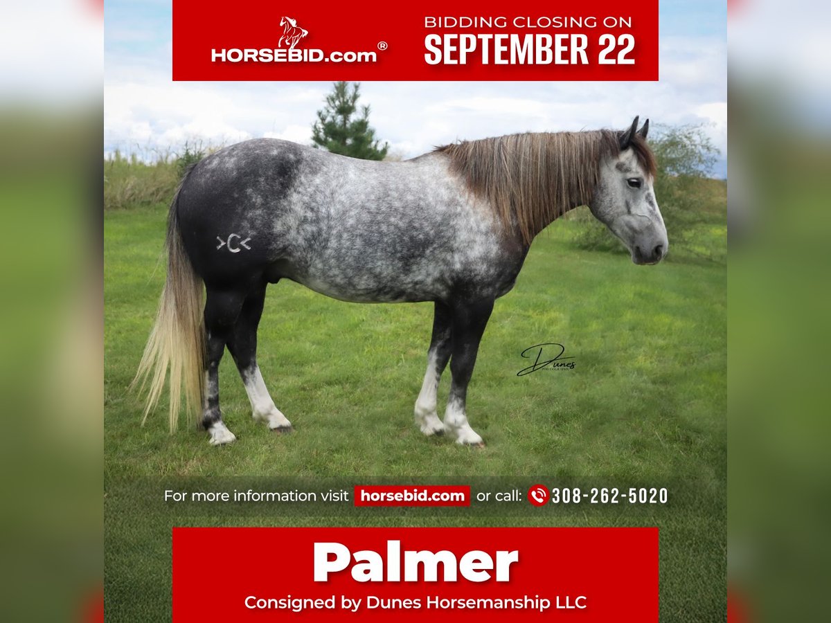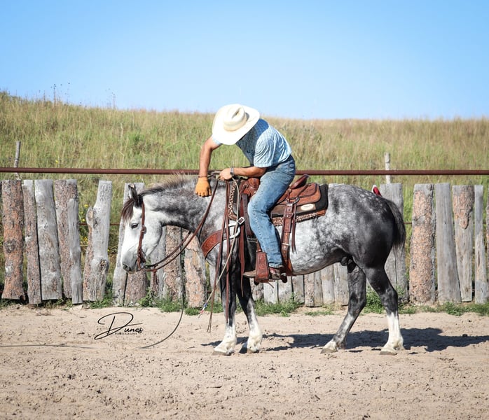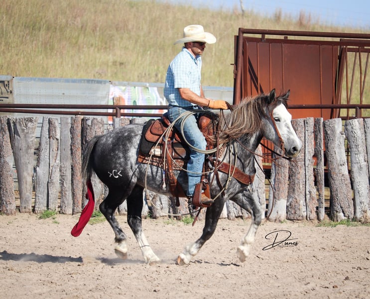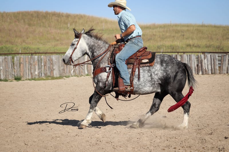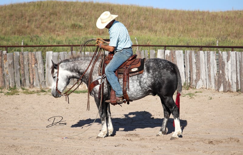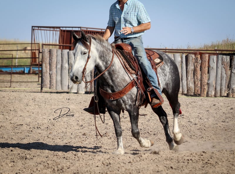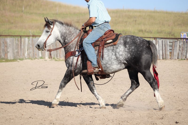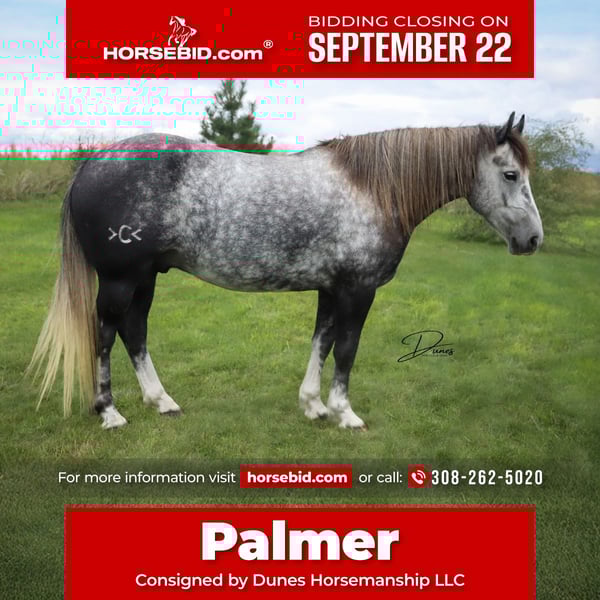 🍁𝒕𝒉𝒆 𝐅𝐀𝐋𝐋 𝑺𝒑𝒆𝒄𝒕𝒂𝒄𝒖𝒍𝒂𝒓🍁 Happening now thru MONDAY | SEPTEMBER 22nd - Available EXCLUSIVELY on HorseBid's website! For more details and to register visit: www.Horsebid.com CONSIGNOR CONTACT: Dunes Horsemanship LLC 308-262-5020 LOCATION: Thedford, NE BREED: Quarter Horse Draft Cross REGISTERED: No REGISTERED NAME: Palmer COLOR: Grey HEIGHT: 14 AGE: 5 GENDER: Gelding Palmer isn’t the kind to go unnoticed! He has dapples on every inch of his handsome bod, and he wears them well! Palmer stands 14 hands tall and is easily 15 hands wide. He is 5 years old but has the resume of a 12 year old! He will be the very first horse to meet you at the gate, regardless of whether he is in a stall or out in a section wide pasture. He is truly a gelding who LOVES the company of his people! He is very user friendly and one who can take a joke for riders who may be less than perfect at mounting gracefully, or who may not have perfect hands. We feel he is suitable for someone who has graduated their old faithful (or two) and are ready for a younger horse who has a few more buttons and a little more pep in their step, but still needing something safe and sane to take care of them. Palmer is the kind you can kick out on pasture in the fall and go grab him in April, saddle tight and leave the barn knowing you will have a great time and get home safe! We have focused most of Palmer’s training in the arena. He is patterned on the barrels and lopes a nice set! He has been hauled some to local play days and exhibitions to see the sights and hear the sounds and taken it all in stride. He has a lead departure that would make a reiner jealous, and the softest cadenced lope to go with it. He will go as fast or slow as you need him to. He is started correct and slow behind the Heel-O-Matic and showing an immense amount of talent with it! We truly feel he could make a seriously competitive junior heel horse or a breakaway horse for a teenager looking to have an easy prospect. We’ve had him really hustle after a calf, then come right back to your hand and almost lope in place he’s so smooth. Palmer is fantastic in town around all the noise and chaos that city life has to offer. From traffic to a train barreling by, he has taken everything in stride and is the confident kind that will take the lead when others are hesitant. We have used Palmer some on the ranch as well. He has drug calves to the fire to brand and gathered and moved cows as well. He has more motor to him on the ranch and is one who can cover the big circle twice and still have gas in the tank. Palmer is barefoot and easy to trim by myself. He is patient with me being meticulous and will stand quietly as long as needed for the perfect pedicure. He is current on all vaccinations, deworming, and is ready to enjoy the fall with his new family! As with any of our horses, a successful relationship between you and one of our horses is paramount. If you ever need, bring him back for a free tuneup at any time! Sometimes the peace of mind just dusting off of cobwebs after a long winter puts your mind at ease and we are happy to help! Please reach out for any questions or to schedule a time to come take him for a spin! We are happy to get any additional specific video or photo you may need to make the bidding process easier! Tess Chytka 308-262-5020