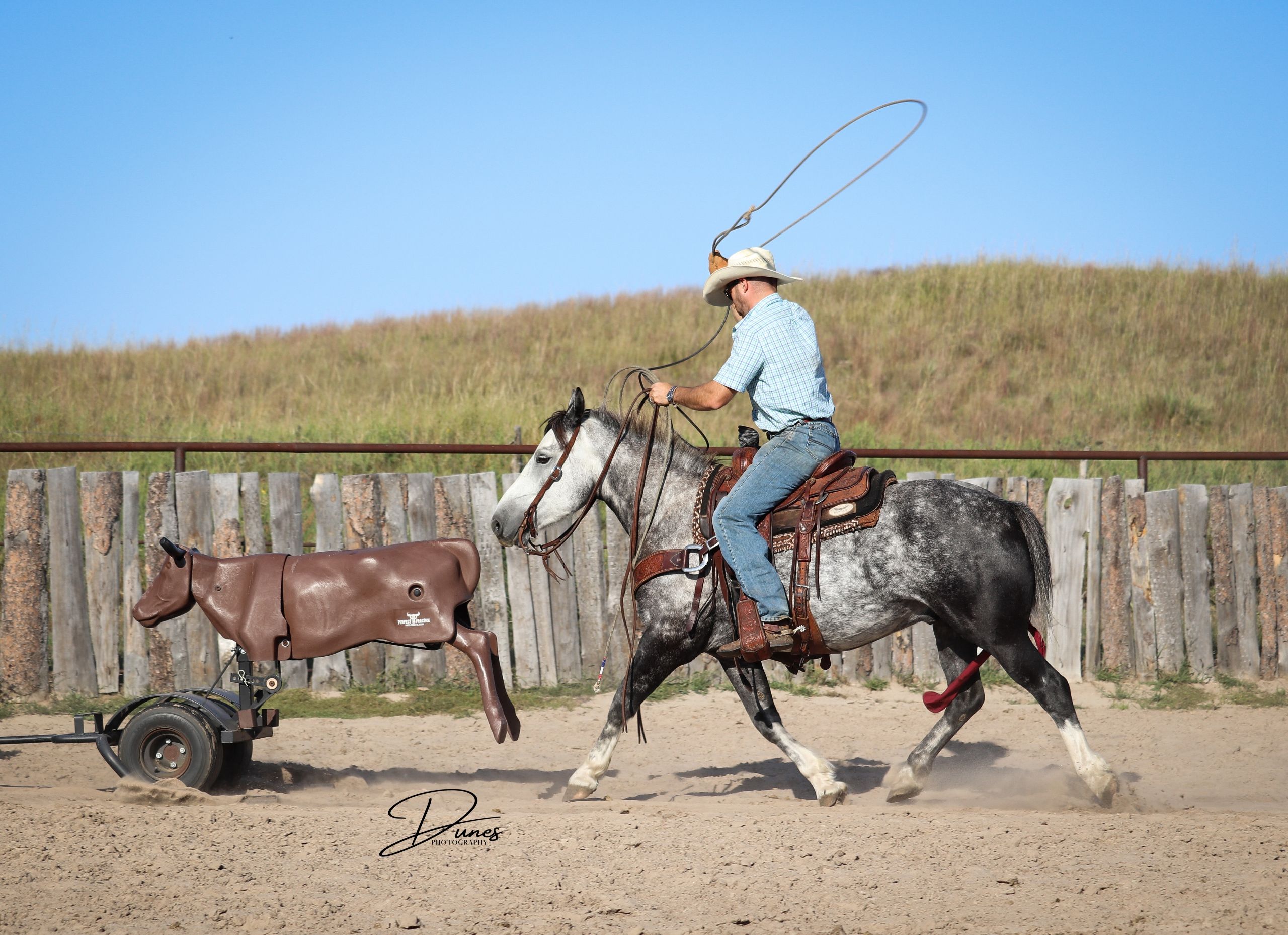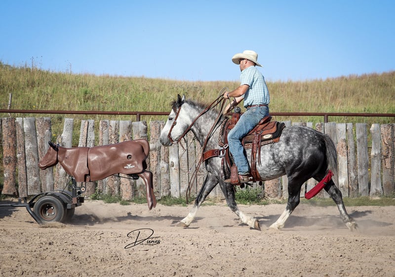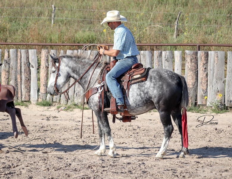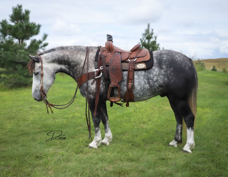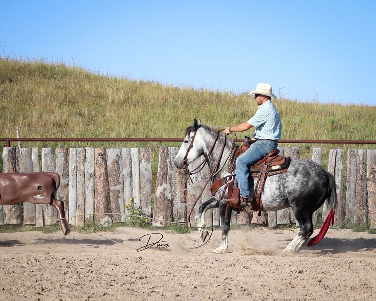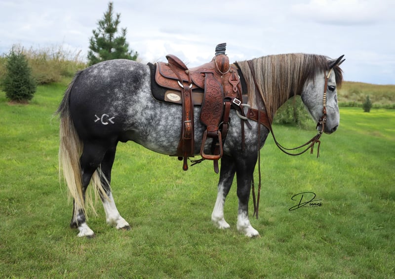 🍁𝒕𝒉𝒆 𝐅𝐀𝐋𝐋 𝑺𝒑𝒆𝒄𝒕𝒂𝒄𝒖𝒍𝒂𝒓🍁 Happening now thru MONDAY | SEPTEMBER 22nd - Available EXCLUSIVELY on HorseBid's website! For more details and to register visit: www.Horsebid.com CONSIGNOR CONTACT: Dunes Horsemanship LLC 308-262-5020 LOCATION: Thedford, NE BREED: Quarter Horse Draft Cross REGISTERED: No REGISTERED NAME: Palmer COLOR: Grey HEIGHT: 14 AGE: 5 GENDER: Gelding Palmer isn’t the kind to go unnoticed! He has dapples on every inch of his handsome bod, and he wears them well! Palmer stands 14 hands tall and is easily 15 hands wide. He is 5 years old but has the resume of a 12 year old! He will be the very first horse to meet you at the gate, regardless of whether he is in a stall or out in a section wide pasture. He is truly a gelding who LOVES the company of his people! He is very user friendly and one who can take a joke for riders who may be less than perfect at mounting gracefully, or who may not have perfect hands. We feel he is suitable for someone who has graduated their old faithful (or two) and are ready for a younger horse who has a few more buttons and a little more pep in their step, but still needing something safe and sane to take care of them. Palmer is the kind you can kick out on pasture in the fall and go grab him in April, saddle tight and leave the barn knowing you will have a great time and get home safe! We have focused most of Palmer’s training in the arena. He is patterned on the barrels and lopes a nice set! He has been hauled some to local play days and exhibitions to see the sights and hear the sounds and taken it all in stride. He has a lead departure that would make a reiner jealous, and the softest cadenced lope to go with it. He will go as fast or slow as you need him to. He is started correct and slow behind the Heel-O-Matic and showing an immense amount of talent with it! We truly feel he could make a seriously competitive junior heel horse or a breakaway horse for a teenager looking to have an easy prospect. We’ve had him really hustle after a calf, then come right back to your hand and almost lope in place he’s so smooth. Palmer is fantastic in town around all the noise and chaos that city life has to offer. From traffic to a train barreling by, he has taken everything in stride and is the confident kind that will take the lead when others are hesitant. We have used Palmer some on the ranch as well. He has drug calves to the fire to brand and gathered and moved cows as well. He has more motor to him on the ranch and is one who can cover the big circle twice and still have gas in the tank. Palmer is barefoot and easy to trim by myself. He is patient with me being meticulous and will stand quietly as long as needed for the perfect pedicure. He is current on all vaccinations, deworming, and is ready to enjoy the fall with his new family! As with any of our horses, a successful relationship between you and one of our horses is paramount. If you ever need, bring him back for a free tuneup at any time! Sometimes the peace of mind just dusting off of cobwebs after a long winter puts your mind at ease and we are happy to help! Please reach out for any questions or to schedule a time to come take him for a spin! We are happy to get any additional specific video or photo you may need to make the bidding process easier! Tess Chytka 308-262-5020
