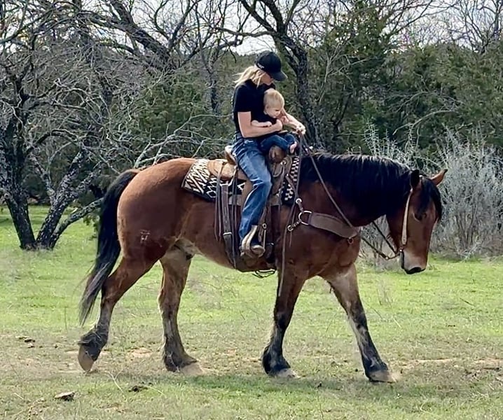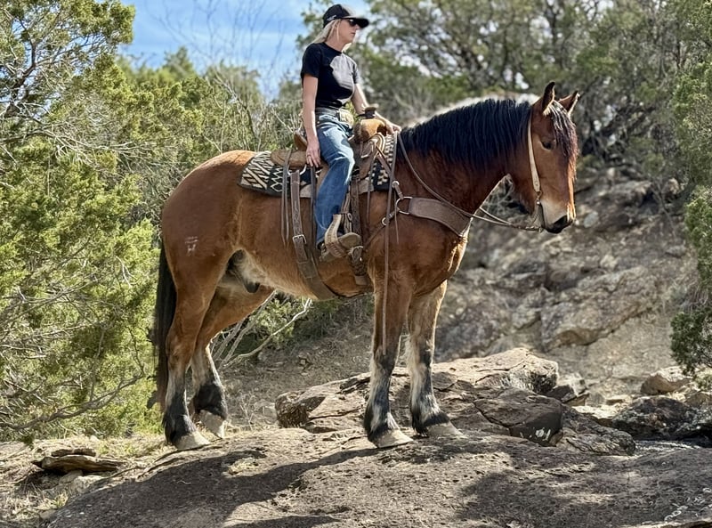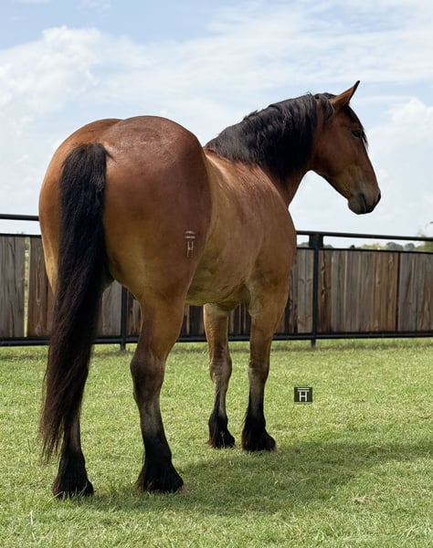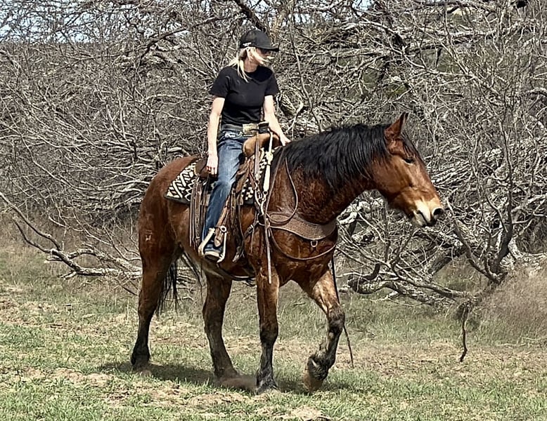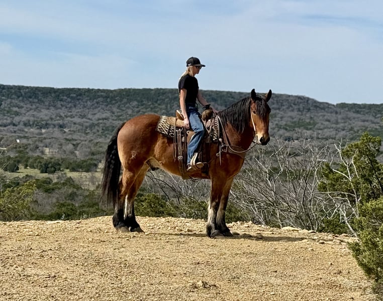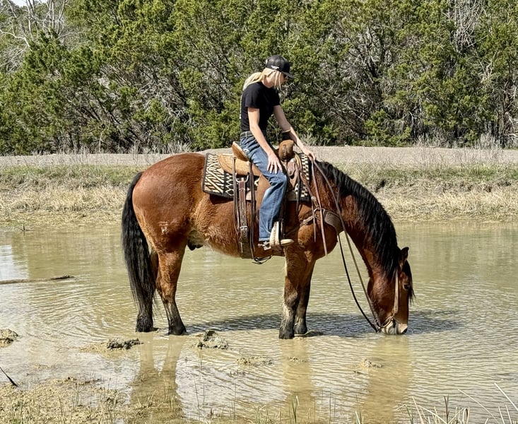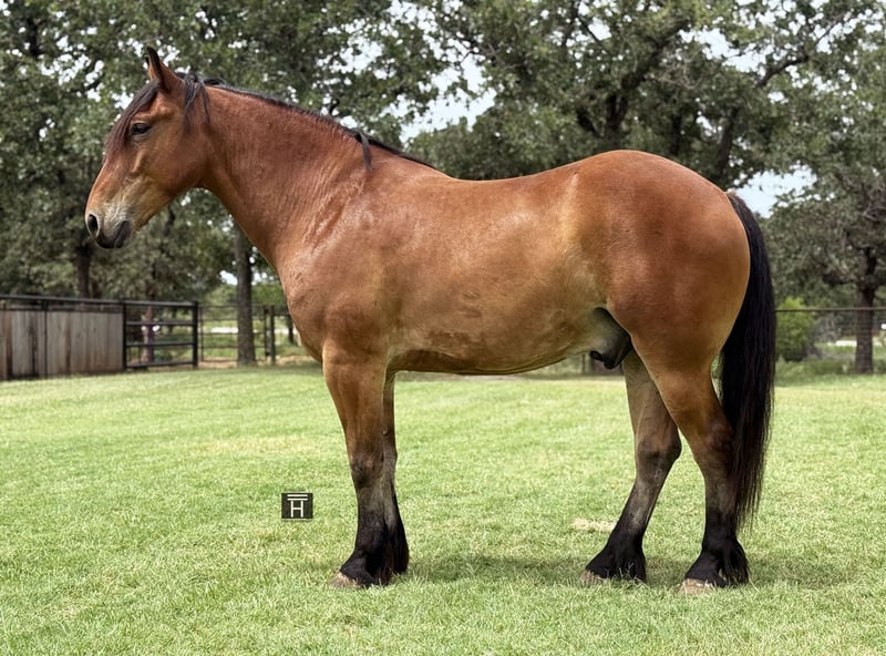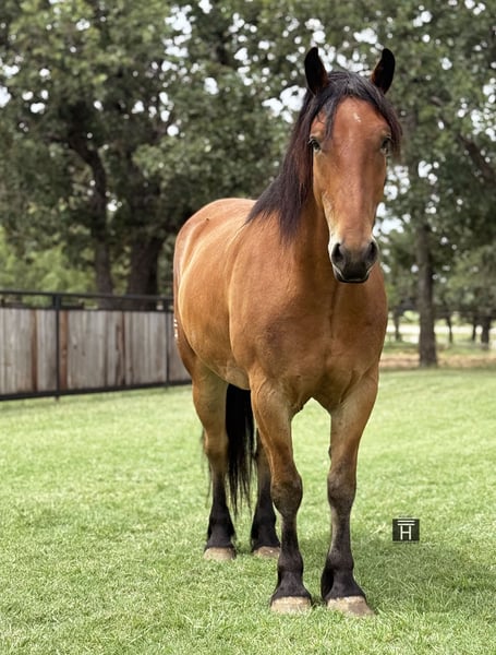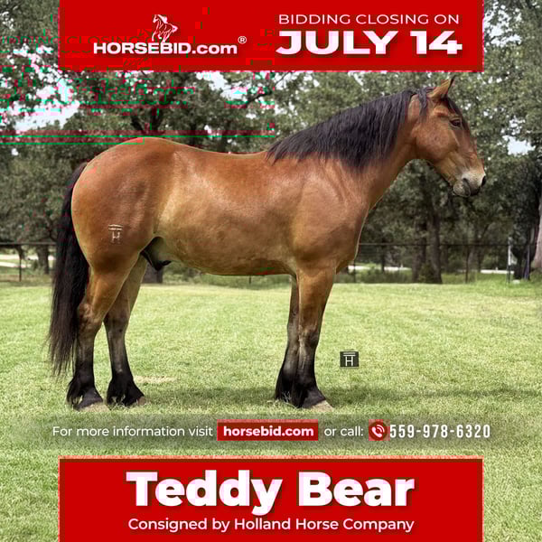 ♦️ MID-SUMMER SHOWCASE ♦️ Happening now thru MONDAY | JULY 14TH - Available EXCLUSIVELY on HorseBid's website! For more details and to register visit: www.Horsebid.com CONSIGNOR CONTACT: Holland Horse Company 559-978-6320 LOCATION: Jacksboro, Texas BREED: Draft Cross REGISTERED: No COLOR: Bay HEIGHT: 16 AGE: 6 GENDER: Gelding Teddy Bear is a one of a kind draft cross gelding standing 16 hands. We have owned him since he was 3 years old and have enjoyed every minute of it. We bought him from the ranch he was born and raised on. He has been a part of our family and it’s time for him to be a part of someone else’s family. He is the definition of safe and gentle. He is as broke and as handy as they get. We have doctored yearlings off of him extensively, sorted, and shipped and used him in the branding pen. He can and would drag a house down if you asked him to. We have trail ridden him, let the kids ride him, jumped him, and pretty much everything in between. He is broke to drive as well. Teddy Bear is very athletic, has a great neck rein to him or will ride in a simple snaffle two handed if preferred. He will go from a walk to a lope with a simple kiss. He has great brakes and moves off leg very well. He could easily make a performance horse in the English or Western world and shows a ton of potential for the fox hunting as well. Teddy Bear gets his name from his extremely friendly and docile demeanor. He is kind and lovable and always happy to get caught and go to work. He’s has great manners, good with his feet, hauls, ties, goes out alone, pastures with anything etc. He is barefoot, sound and straight legged. There is absolutely no funny business with this guy and he can handle time off with no problem. We promise if you meet this guy you will fall in love. The video shows him from when he was 3 until now and how he was born gentle and matured into the big, solid boy he is now. FMI call/text Chanel 559-978-6320. We are happy to answer questions or schedule a test ride!