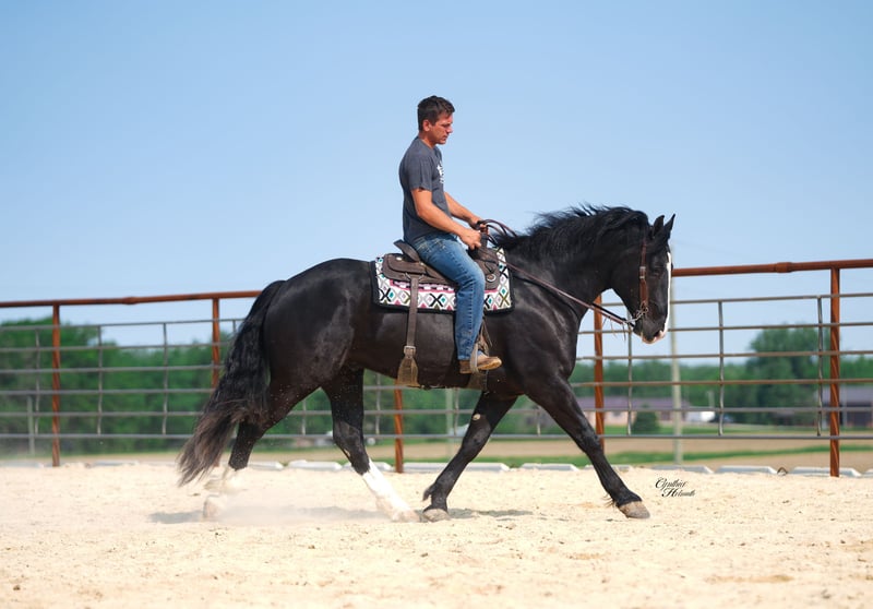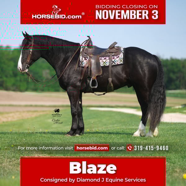 ⚜️𝐓𝐇𝐄 𝐅𝐀𝐋𝐋 𝐇𝐄𝐑𝐈𝐓𝐀𝐆𝐄 𝐂𝐋𝐀𝐒𝐒𝐈𝐂⚜️ Happening now thru MONDAY | NOVEMBER 3rd - Available EXCLUSIVELY on HorseBid's website! For more details and to register visit: www.Horsebid.com CONSIGNOR CONTACT: Diamond J Equine Services 319-415-9460 LOCATION: Fairbank IA BREED: Draft Cross REGISTERED: No COLOR: Black HEIGHT: 16.2 AGE: 5 GENDER: Gelding “Blaze” is a gorgeous 5-year-old draft cross gelding. He stands 16.2 hands and is well broke to both ride and drive, single and double. Blaze has had lots riding in the arena, knows his leads and moves off of leg pressure well. Blaze rides out on trails alone or with other horses with ease. He’s 100% traffic safe and has been ridden on the road and down the trails a lot. Stands for the farrier, bathe, clips very well. Blaze loves attention and always meets you at the gate. We have done all the training on blaze and owned him for almost three yrs. We would love to answer any questions you might have about blaze. For more info on blaze please call Jonas @ 319-415-9460.