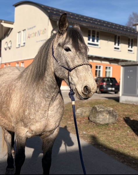 Ferrero, ca 7 Jahre alt (wahres Alter nicht bekannt - geschätzt durch Tierarzt) Stockmaß ca. 1,50 sucht seinen Menschen. Ferrero stammt ursprünglich aus dem Tierschutz und ist ein sehr lieber und menschenbezogener Wallach im Umgang. Er zeigt sich bei einer klaren, ruhigen Führung absolut verlässlich und kernwillig. Mit der richtigen Bezugsperson arbeitet er motiviert mit und möchte gefallen. Er war bei uns als Schulpferd für den Tourismus gedacht, jedoch zeigte sich, dass ihn die vielen wechselnden Kinder und der Trubel stresst. In solchen Situationen reagiert er mit Überforderung und schnappen. Deshalb haben wir uns entschieden dass er es verdient hat seinen Menschen zu kriegen. Kein Anfänger Zuhause und kein Schulbetrieb. Es sollte eine solide Grundausbildung vorhanden sein die ihm Sicherheit gibt und ihn weiter fördert. Er ist einfach im Umgang ... Auch beim Schmied kein Problem. Gesundheitlich hat er noch nie irgendwas gehabt. Absolut gesund und bereit für seinen Menschen. Viel Liebe zum Tier ist Grundvoraussetzung. Aktuell ist er nach der Winterpause etwas eingerostet, da er die letzten 6 Monate pausiert hat. Er wird grad wieder antrainiert. Er war vor ca. 2 Jahren bei Dr. Martin Pauli, Solla in der Grundausbildung. Er zeigt sich motiviert und schnell wieder auf seinem vorherigen Ausbildungsstand. Weitere Infos jederzeit möglich.