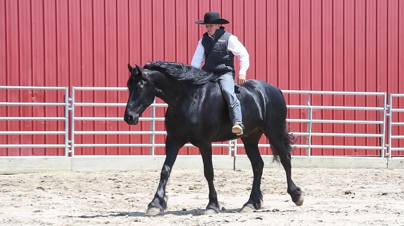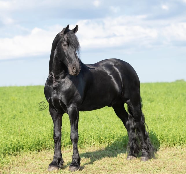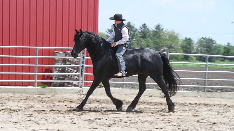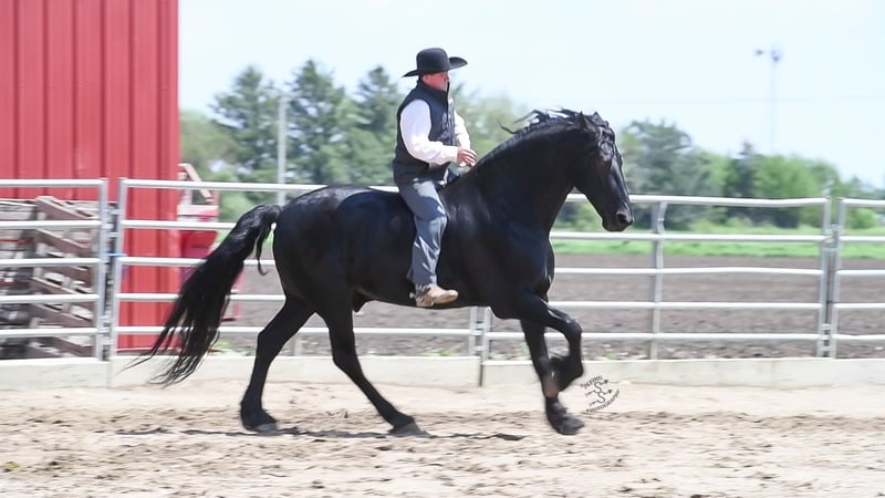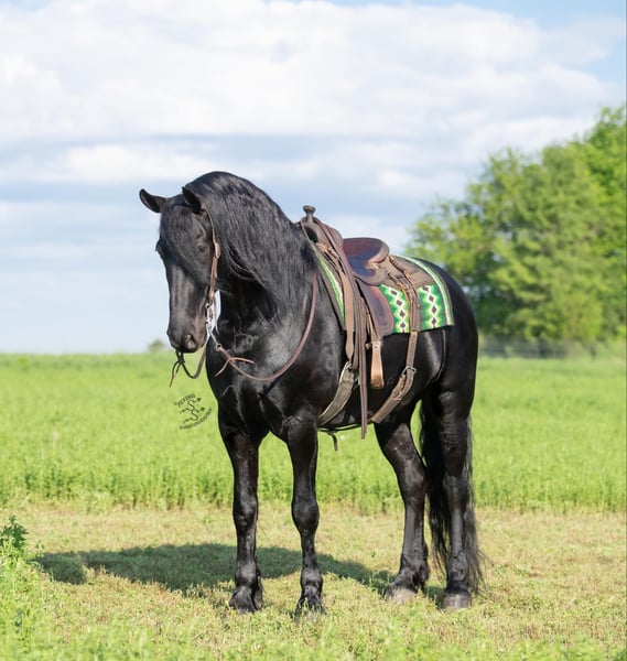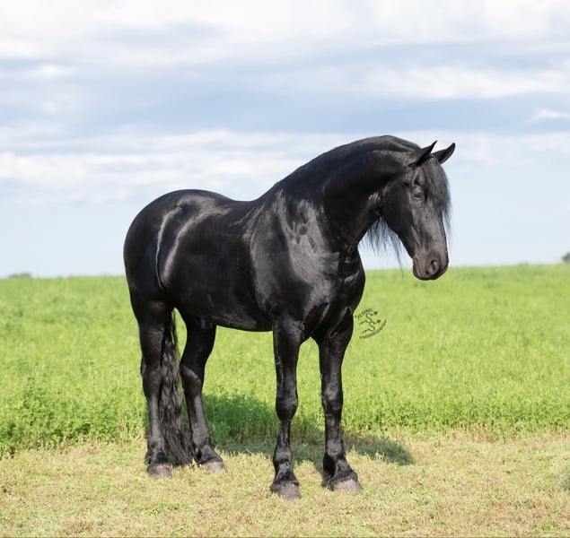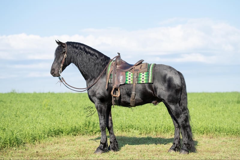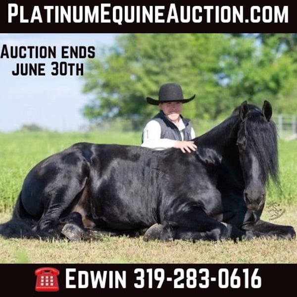 ONLINE AUCTION PLACE YOUR BIDS AT PLATINUMEQUINEAUCTION DOT COM $3500 STARTING BID AUCTION ENDS JUNE 30TH Have you been dreaming of owning that Once In A Lifetime Horse or Fairytail Type of horse if so I’ve got the perfect one for you! Meet Tornado Boy the coolest 5yr old Black Registered 75% Friesian 25% Morgan gelding that stands right 16.1 hands and is as pretty as they come with all the looks that Guaranteed will get you noticed wherever you go with him and on top of that he’s the most Gentle and people friendly horse I’ve ever owned,he’s one that could be content just being brushed and pampered on all day and absolutely loves it.Tornado Boy is a barn favorite and is a very special horse to us and will be hard to let go but very excited to find his forever home that he deserves,This special boy has been with us and in my program for a full year and I don’t think there’s one thing we haven’t done with this horse, he is as versatile and broke as they come it don’t matter if it’s Riding English,Western,Bareback,Bridles,Driving he’ll do it!And if you would like to take a stroll down town he sure will do that as well. Tornado Boy has seen every bit of all the outside miles riding out in open fields,he’ll go through rough terrain up and down steep hills, over logs and cross creeks and through belly deep water,goes through the obstacle courses,he’s one that you can cross the country with a nice loose rein and does it with ease no matter if it’s walk, trot or canter,and will lope nice circles out in the open fields,he has seen many miles on the roads in very busy traffic and down town,we’ve had him on over night trips he’s been out after dark many times both riding and driving and takes it like a champ .Tornado Boy is also very broke in the arena where he has a one hand neckrien,knows all leg cues and is very soft in the bridle and supple in his body parts,he has three very smooth gates W/T/C and for sure his canter, you could lope him all day and not getting tired of it,he will side pass,pivot,open/close gates and as you can see he does that all with out a bridle as well being ridden bareback with absolutely nothing on him that’s just how willing and the great mind he has and does good with the tarp,ball and bullwhip.Now let me tell you about how gentle he’s is and how much he loves attention Especially from little ones and you can feel 100% safe when they are around him,The niece and nephew sure have enjoyed playing with him and having rides on him,it don’t matter how old or how young you are he will take care of you and whatever you ask he will do so and as I haven’t mentioned he has seen many miles on the trails and absolutely loves it and is a dream to go trail riding. Tornado Boy has also had a lot of English riding and is doing great with that as well,he knows all his transitions, he’s doing great on his lateral work and sure is a pleasure to ride in English tack as well, he has that smooth uphill canter what people are looking for and also if you looking for a dream carriage driving horse Tornado Boy would be the one The whole family has driven him no matter if it’s through the day or in the dark he has done it and sure is a joy to drive and as you can see you can hitch him up by yourself and will stand patiently. Tornado Boy does great being stalled and out in pasture with other and never gets into trouble he’s always Quiet and takes care of himself.He is absolutely perfect to shoe my farrier has said many of times that he is a complete gentleman and does not flinch at all and that is a plus!He stands tied to be groomed,saddled and to mount and if you don’t have a stepstool you can take him alongside a fence or you name it and get on from there or lay him down and get on from there and that’s another thing he loves to do is laying down and will lay his head in your lap,he is also great being bathed.Tornado Boy is up to date on dewormer and teeth and is very healthy and stays sound, he is very easy to have around and a easy keeper. So if you’re looking for that true all round family safe type horse that is suitable for the whole family and is an absolute pleasure to have around you definitely wanna check out on Tornado Boy!!! The little ones call him pretty boy as a nick name for a reason! If you have any questions on this pretty boy or wanna set up a time to come see him in person please contact Edwin Raber 319-283-0616 NO TEXTS- I can only take calls and voicemails. Thanks
