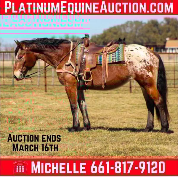 ONLINE AUCTION Place your bids at www.PlatinumEquineAuction.com Starting Bid $3500 Auction ends March 16th, 2025 Need a new saddle? Check out White Rock Saddles on our website or Facebook! Are you ready to add a unique and gentle spirit to your life? Let us introduce you to Helen, a stunning 14-year-old Percheron-Appaloosa draft cross mare standing 16.1 hands! This big beauty isn’t just a head-turner; she comes with a special trick! Helen will side pass right over to you from the fence or mounting block, making getting on a breeze. Helen is the epitome of a steady trail companion. She’s not a speed demon—she’s built for comfort and companionship, perfect for leisurely rides through nature. Whether you’re navigating hills, crossing logs and bridges, or splashing through water, Helen takes it all in stride. With many miles of trail experience under her hooves, she knows just how to make your ride enjoyable and worry-free. This lovely mare has spent summers on a dude string, helping tourists experience the beauty of the trails, and now she’s ready to bring her calm and easy-going nature to your adventures! Helen is big enough to carry anyone, making her an excellent choice for riders of all levels, from a seasoned pro to an advanced beginner’s would get along with her. She’s not the fanciest horse with all the buttons, but she’s gentle , easy and user friendly to enjoy. Just get on and go for a ride type of gal. Riding Helen is all about enjoyment and building confidence without the frustration. Plus, she’s adaptable! Helen is just as happy living in a pasture as she is in a cozy stall. And let’s be honest—your friends will be envious of this cool, unique gal who stands out from the crowd! If you’re looking for a reliable, gentle companion who’s ready to hit the trails and make memories with you, Helen is the one! Don’t miss your chance to bring this sweet mare into your life! Contact us to come try her, or we can set up a FaceTime also . M $ Performance Horses Michelle 661-817-9120 If you need help with transport don’t hesitate to ask we have a list of reputable haulers that can get her safely to your doorstep WORLD WIDE including, Alaska , Mexico, Hawaii and Canada. ONLINE AUCTION Place your bids at www.PlatinumEquineAuction.com Starting Bid $3500 Auction ends March 16th, 2025 Need a new saddle? Check out White Rock Saddles on our website or Facebook!