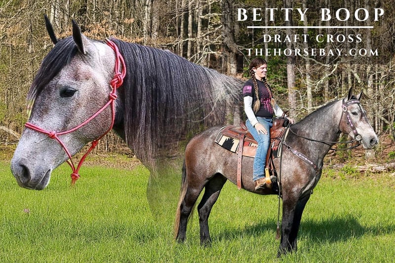 Wowza-Wowzaaaaaa…Take a look at this gorgeous Grey Draft Cross Mare!!! She’s simply amazing. Gentle, good-minded, and broke, this horse is a dream to own. If you don’t like attention, don’t buy this gal. Everywhere she goes, she gets compliments. Trail rider deluxe, nonspooky, traffic and water safe. The great age of 5/6 yr old, 15.3h of pure enjoyment. She’s been there and done that on the trail. Bridge crossing, water crossings, packing, or whatever you throw at her. She will get the job done. She has extensive experience and has done a wide range of things. Rides and drives. Drives single and double Smooth walk, trot, and canter. BETTY is a Draft Horse/ Quarter Horse Cross, the best of both worlds. Would also make a great broodmare. Sweet as sugar and always willing to please. Enjoys being your partner and exploring trails. Lots of trail riding experience. Stands tied, loads, shoes, baths. Easy keeper and utd on everything. Great ground manners. Everyone who sees her falls in love with this gentle giant. Done parades, wagon trains, and mounted patrol training. You’d be hard-pressed to find one much better than her.