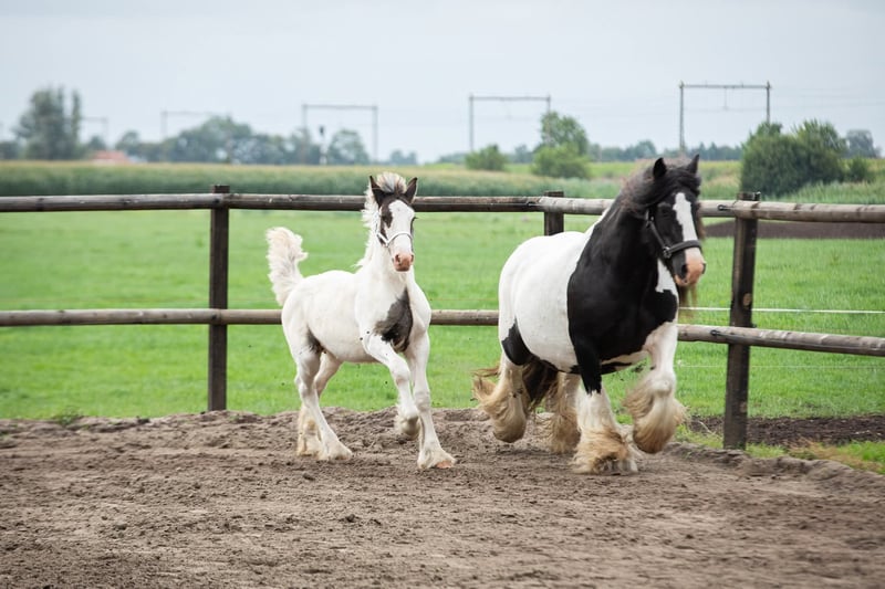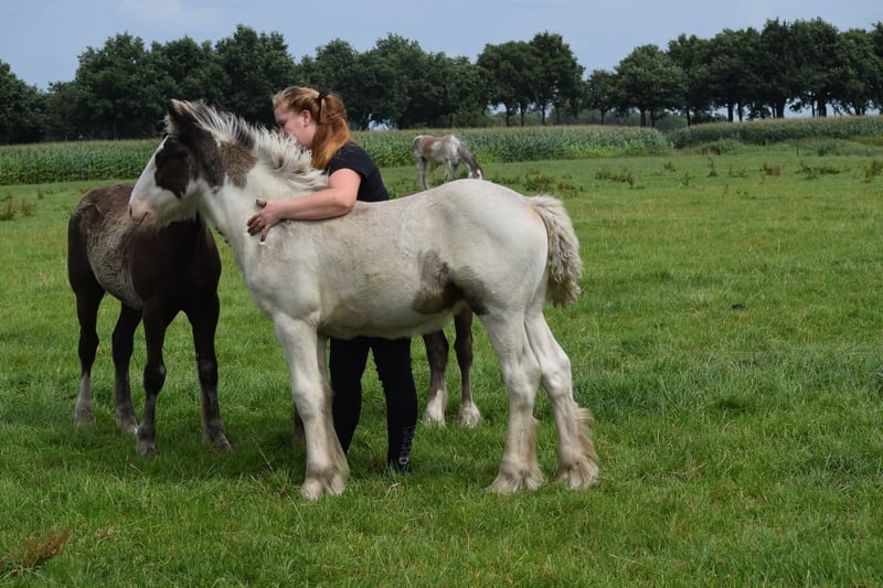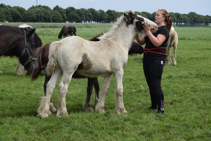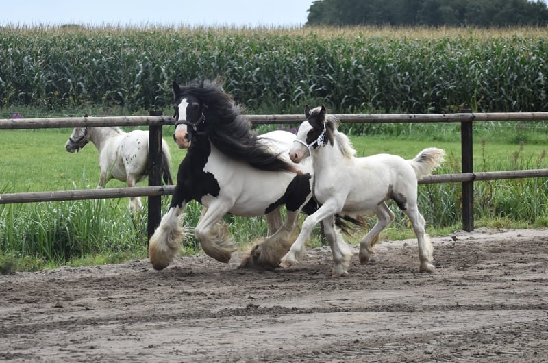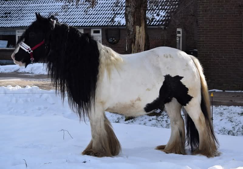 White Knight is a stunning colt. He is expected to grow to a height of approximately 1.60/1.65 meters. Mother is a Tinker mare. Father is a Clydesdale stallion, Stobilee Proclamer. He received his first premium and was awarded day champion at the NSvT inspection.