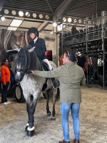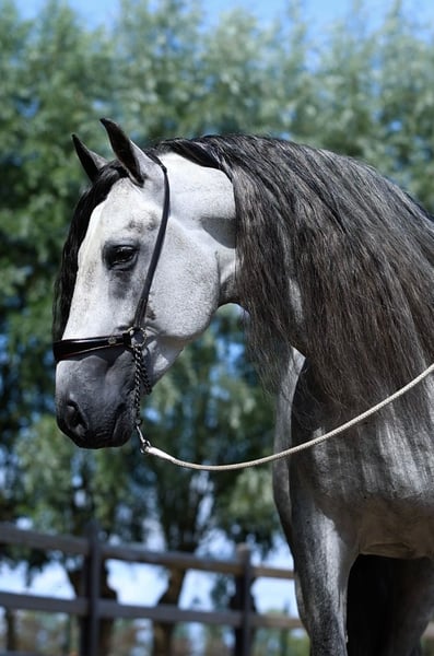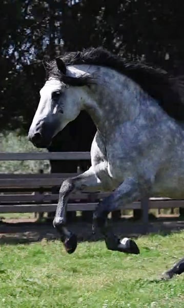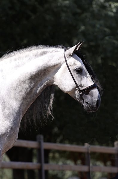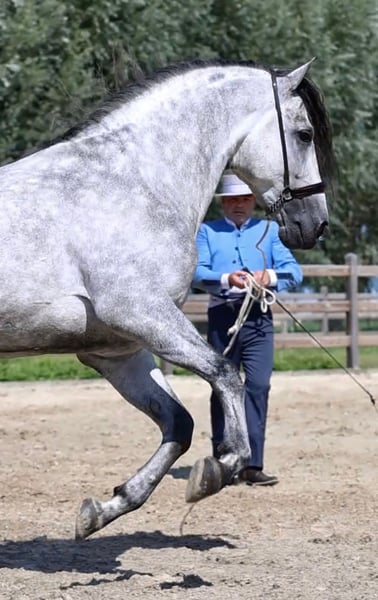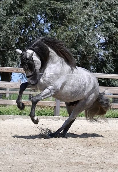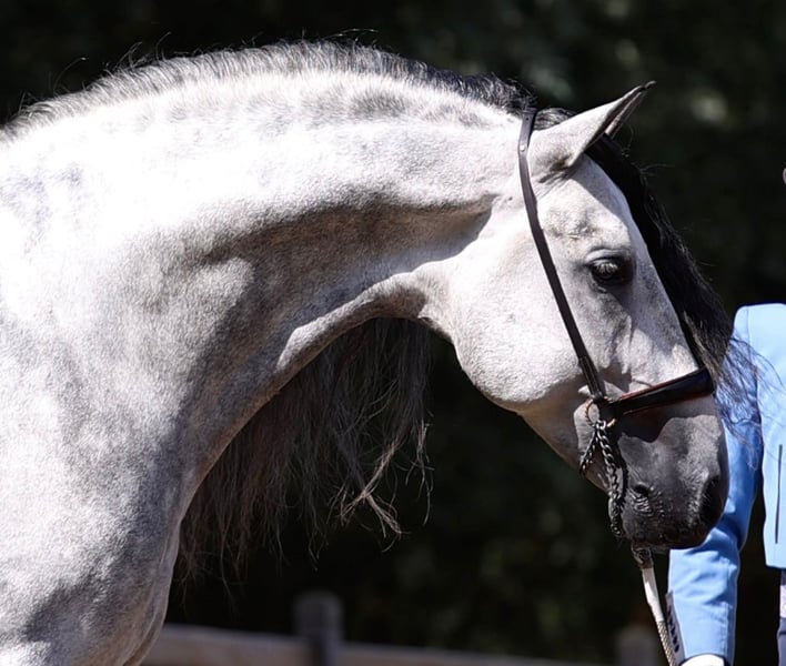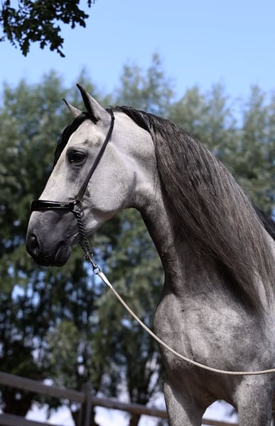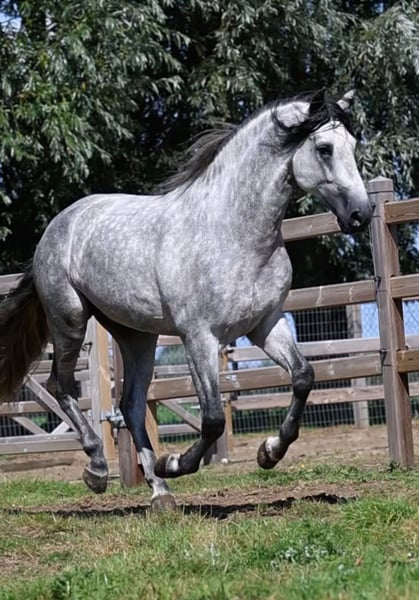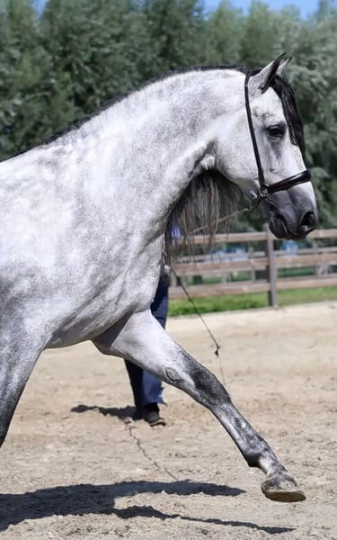 Espabilado de Centurion (2019), 1.69m With his unique pedigree, he has the very best bloodlines, both on the maternal and paternal sides. Son of 'Kabileño VIII' and 'Fer Bago' He was born in 2019 and is still in full development. He is already making an impression in terms of build and size. This bodes well for his future! We are already looking forward to it! He proved himself immediately in his first competition in which he participated in 2023. At the CCE2023 of ANCCE Belgica, he achieved a 1st place for 'best movements' in section 8 (4-year-old stallions) and overall a silver medal. He achieved a total score of 79.771 (62.063 morphology, 22 movement, 17.708 function) Color: Grey - Genetic color code GgAaEeCCNN