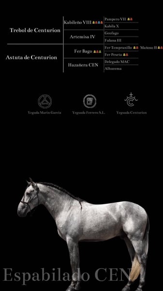 Espabilado de Centurion (2019), 1.69m Met zijn unieke stamboom heeft hij de allerbeste bloedlijn, zowel langs moeders - als vaderslijn. Son of 'Kabileño VIII' and 'Fer Bago' Hij is geboren in 2019 en dus nog volop in ontwikkeling. Nu maakt hij al indruk qua bouw en grootte. Dit belooft voor zijn toekomst! We kijken er al naar uit! Hij bewees zich al onmiddellijk in zijn eerste wedstrijd waarin hij deelnam in 2023. Op de CCE2023 van het ANCCE Belgica behaalde hij in sectie 8 (4 jaarse hengsten) een 1ste plaats voor 'best movements' en in het algemeen een zilveren medaille Hij behaalde maar liefst 79.771 in totaal (62.063 morf, 22 mov, 17.708 funct) Kleur : Grey - Genetische kleurcode GgAaEeCCNN