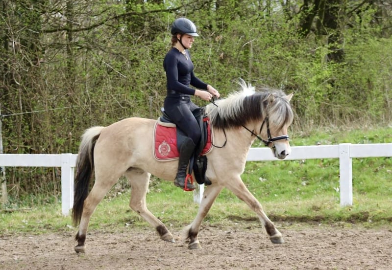For Sale: Fjord Pony – Young, Charming Mare for Leisure Riding Coming directly from the breeder, meet MAGDA, a beautiful purebred Fjord mare with excellent pedigree. Magda was raised in a Fjord herd under species-appropriate and breed-appropriate robust management. She is a medium-sized pony with no social issues. Currently, she lives in her training stable within a mixed herd of Fjord ponies and riding ponies, in a combination of box stalls (at night) and a large pony group outside during the day. She is barefoot and has very good horn growth. This young Fjord mare is curious and extremely friendly in her interactions. She is very relaxed during groundwork and always positive when faced with new tasks! She was very easy to ride when initially backed and can now be ridden in all three basic gaits free. However, we do not recommend her for beginners yet, as her fundamentals should be further reinforced, and Magda’s work enthusiasm should be nurtured! She will develop into a very fine riding pony, demonstrating all the advantages of a Fjord. She has already participated in her first group rides and was very well-behaved throughout. She currently measures approximately 1.40 meters (about 14.1 hh), which suits her very well. The rider in the photos and videos is 1.70 meters tall. Please feel free to contact us if you would like more information about this sale pony. The mare is located with our former apprentice, who specializes in this breed. You are welcome to meet her in person!