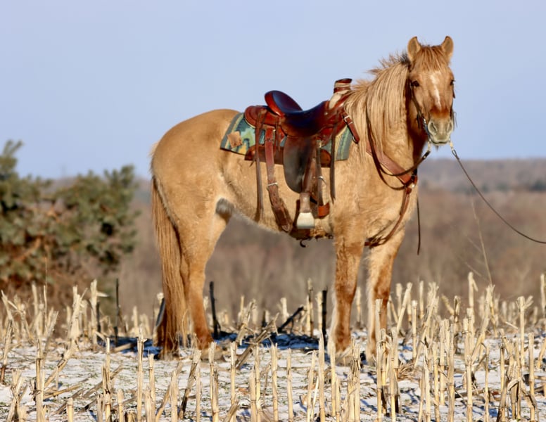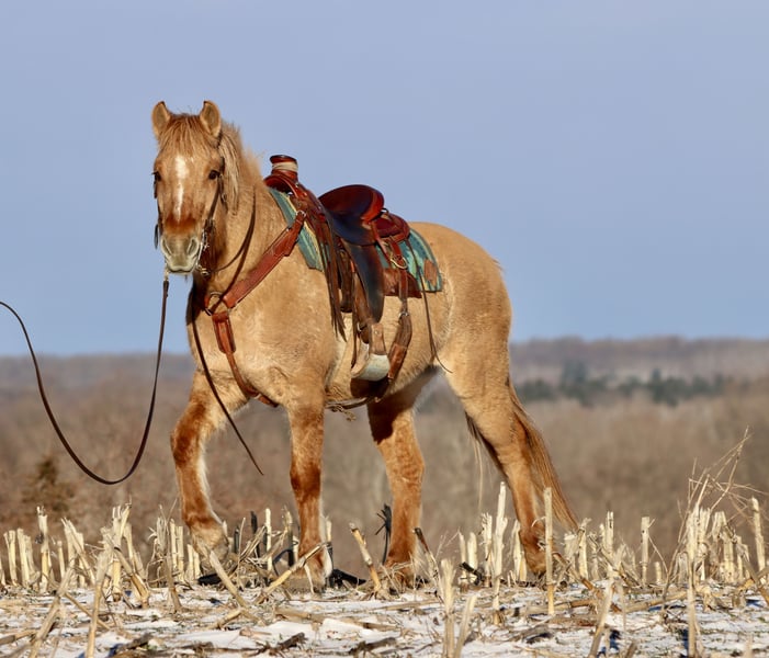 "AVAILABLE ON ONLINE HORSE AUCTION AT www DOT MagicHorseAuction DOT com BIDDING OPEN NOW thru TUESDAY | MARCH 17TH! BUY IT NOW AVAILABLE! *Final price will be determined on auction site* CONSIGNOR CONTACT INFO:Kate Shavalier #231-670-7101 LOCATION:Hesperia, Mi" "Bets is a 4yr old red dun Fjord Draft Cross mare standing at 15.1 hands tall and very stout. Her dad is a registered Fjord, and her mom was a Percheron cross. And we purchased Bets straight from the breeder, so there are no unknowns with her. You get her full history. Bets really takes after the Fjord side and is a good example of the breed. She is VERY smart and she catches on to new things quick you don’t have to show her twice. She has a drafty build so can easily carry a heavier rider, however she is not your typical draft she is agile and can move around like a quarter horse. So when you are on her it feels like you’re riding a nice stout quarter horse. She is a trail MACHINE! She will go ANYWHERE I point her. She has NO fear of water whatsoever. In the video, you’ll see her go into the river. What you don’t know is that the first time I took her in the river, she was ready to swim across it. But since it’s winter, I didn’t want to go for a swim. She’ll also cross huge logs and little wooden bridges. She’ll hop right up the steep banks and pick her way down a steep hill carefully. She is a regular powerhouse so those big hills do not intimidate her. She has a very nice smooth canter and a smooth trot. She has this little jog trot she’ll do that is easy to sit to. And she can do a more medium paced trot that is easy to post to. She will leave home alone just fine. She can lead or follow out on the trail and will separate away from the other horse. She is fine if the other horse takes off without her. She stands stock still for mounting, she loads right in and backs right out of a trailer, and good for getting her feet trimmed. She is middle of the pecking order. And an easy keeper. Gets along well with the other horses. She knows how to move her shoulders and hindquarters off the leg. And she also will neck or direct rein. She’s good with traffic coming from in front or behind her. We have even met up with the snow plow trucks a few times out on the road and she never blinks an eye at it. She is very safe does NOT spooky easily. NO bad habits or vices and NO maintenance required. Again we purchased Bets straight from the breeder was able to see both her parents and since we bought her we were able to start her the right way with the right foundation under her. She has a sweet personality and worms her way into your heart especially with those big soft doe eyes. I’ll end with this the first time you ride Bets you’ll love her you just can’t go wrong with her. She just has the right mindset, the right build, and very nice smooth gaits. She comes up to date on vaccines, dewormings, coggins, and vet check. Just call to set up a time to come see her or to ask any questions."