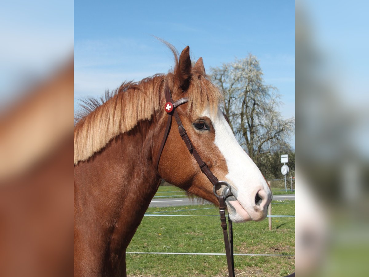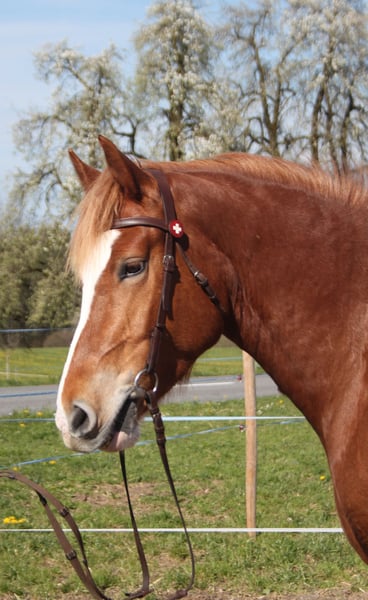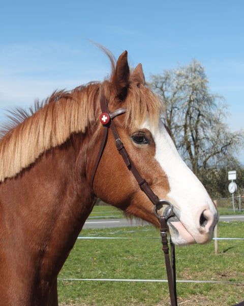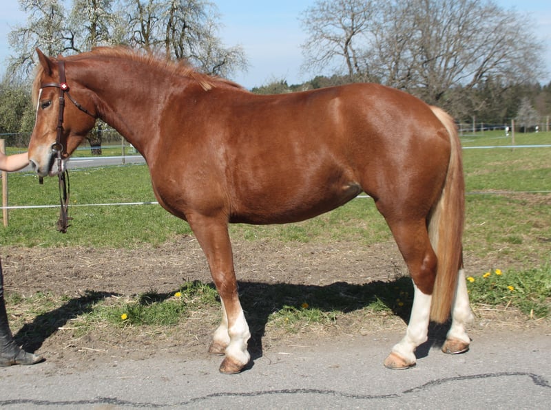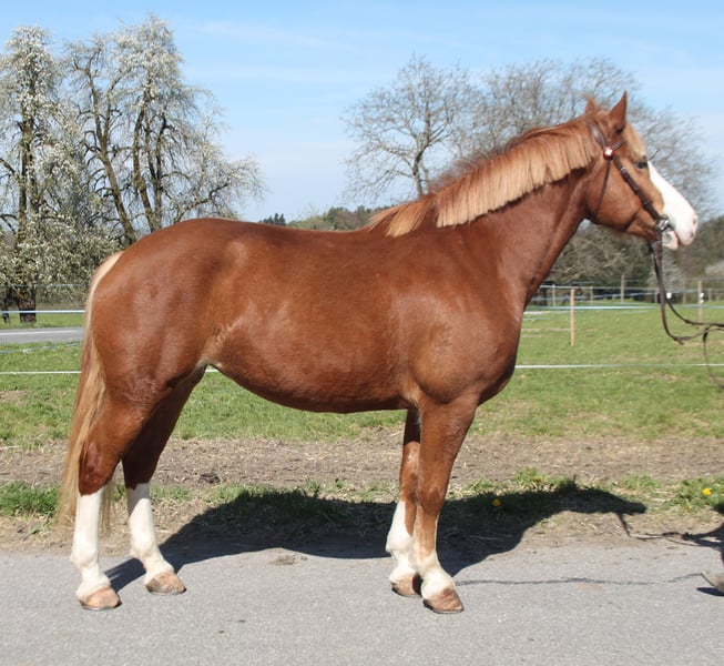 Fuchsstute, 6 jährig, 160 cm, kräftiger Körperbau Die hübsche Stute arbeitet gerne auf dem Sandplatz, zeigt sich dort angenehm motiviert und rittig, kann auch von nicht so geübten Reitern geritten werden. Kennt Longenarbeit, Sitzlonge - durchaus denkbar sie auch als Voltigepferd einzusetzen. Sie wird viel im Gelände geritten - auch von Kindern und Jugendlichen: hier ist sie absolut nicht schreckhaft, von sich aus angenehm fleissig, schaut nichts an und ist nicht guckig. Auch alleine problemlos! Sie wird auch regelmässig gefahren. TOP verkehrssicher! Im Umgang ist sie tadellos: kann von Kindern geführt, geputzt, Hufe auskratzen und zum Reiten bereit gemacht werden. Problemlos zum verladen sowie beim Hufschmied. Sie kennt Boxenhaltung - und Offenstallhaltung. In der Gruppe mit anderen Pferden und Ponys zeigt sie sich nicht dominant - sie ist mitten in der Rangordnung. Sie ist auf einem lebhaften Landwirtschaftsbetrieb mit grossen Maschinen und Traktoren, spielenden Kindern... zuhause.