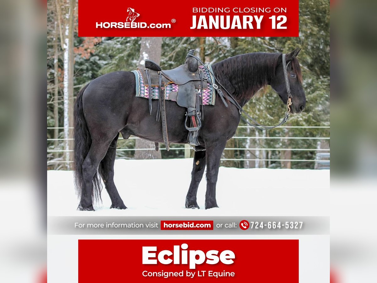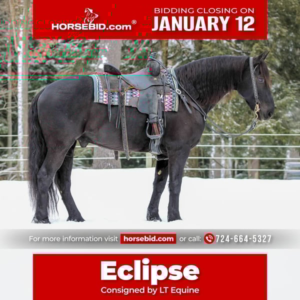 ♦️𝐍𝐄𝐖 𝐘𝐄𝐀𝐑'𝐒 𝑬𝒙𝒕𝒓𝒂𝒗𝒂𝒈𝒂𝒏𝒛𝒂♦️ Happening now thru MONDAY | JANUARY 12th - Available EXCLUSIVELY on HorseBid's website! For more details and to register visit: www.Horsebid.com CONSIGNOR CONTACT: LT Equine 724-664-5327 LOCATION: Miola, PA BREED: Friesian Cross REGISTERED: No REGISTERED NAME: Eclipse COLOR: Black HEIGHT: 15.1 AGE: 10 GENDER: Gelding 🌑 Eclipse — A Rare, Proven Friesian Cross for any Rider 🌑 Offered for consideration is Eclipse, a 10-year-old Friesian Cross gelding with the kind of versatility, temperament, and experience that is increasingly hard to find. Standing 15.1 hands with a substantial, well-balanced build, Eclipse is an exceptional fit for a wide range of riders. He is suitable for any level, offering a quiet, confidence-building ride while still being enjoyable and responsive for an experienced horseman. Eclipse is soft and uncomplicated to ride at the walk, trot, and canter, with a smooth, comfortable trot and lope and reliable lead departures. He goes English or Western, neck reins willingly, has a solid stop and backup, and is equally dependable in the arena or out on the trail. A true all-around partner, Eclipse rides and drives and has been a young rider’s primary horse for the past four years, handling everything from daily driving to English and Western riding with consistency and reliability. He stands quietly for mounting, rides bareback, and carries himself with the steady demeanor of a horse that knows his job. On the ground, Eclipse is a pleasure to handle—kind, personable, and well-mannered. He stands tied quietly, bathes with ease, and loads and hauls without issue. Eclipse is the definition of a “been there, done that” gelding—a quality individual suited for someone seeking a safe, versatile, and polished horse they can confidently enjoy from day one. Eclipse has a current Health Exam by a vet, a Fresh Coggins and 5 ways vaccination. For more information please contact me! 724-664-5327 • 10-year-old Friesian Cross gelding • 15.1 hands | Substantial build • English & Western | Rides & Drives • Trail and arena proven