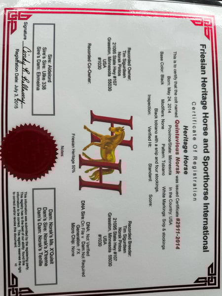 ONLINE AUCTION Place your bids at www.PlatinumEquineAuction.com Starting Bid $3500 Auction ends December 15th, 2024 Need a new saddle? Check out White Rock Saddles on our website or Facebook! Flash is a 16H, 2015 model registered Friesian Heritage Horse gelding that is broke to ride and drive. If you like them fancy and sporty looking, he is your guy!! He has been rode threw ditches, over logs, through creeks and down the trail. He stands to clip, shoe, brush, bathe, saddle and bridle. He is easy to catch in the barn or out in pasture. He gets along great with other horses. He is updated on his coggins worming and rabies vaccination. He sells 100% sound!! For more information feel free to call Norman with Silver Star Stables 319-284-0001 I will be sure to answer any of your questions. ONLINE AUCTION Place your bids at www.PlatinumEquineAuction.com Starting Bid $3500 Auction ends December 15th, 2024 Need a new saddle? Check out White Rock Saddles on our website or Facebook!