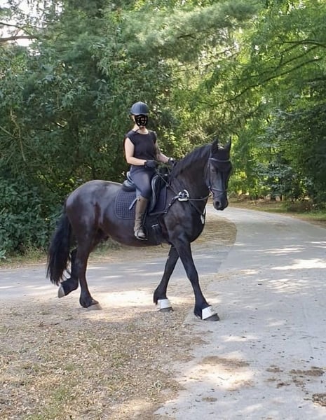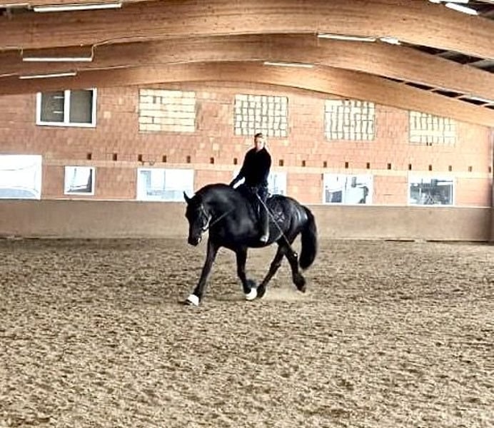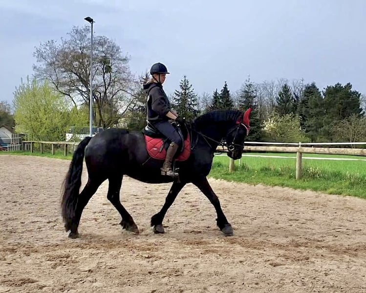Zum Verkauf steht ein liebenswerter, umgänglicher, 13 jähriger Friesenwallach, mit eindrucksvollem Erscheinungsbild und einem ausgeglichenen, menschenbezogenen Charakter. Gondor wird Englisch geritten und kennt sowohl Platz als auch Hallenarbeit. Er zeigt sich stets lernwillig und motiviert. Auch im Gelände ist er ein sicherer Begleiter. Ob allein oder in der Gruppe. Er bleibt ruhig, aufmerksam und zuverlässig. Die Boden- und Freiarbeit macht im genauso viel Spaß. Er arbeitet engagiert mit und möchte für seinen Menschen alles richtig machen. Momentan steht der Hübsche tagsüber auf einem Wallachpaddock und nachts in seiner Box. Er kennt aber auch Offenstallhaltung und fühlt sich dort ebenso wohl. Er wird ausschließlich in reine Wallachherden abgegeben, da er in gemischter Herde, Hengstverhalten zeigt. Reine Boxen- oder Einzelhaltung ist ausgeschlossen, da für ihn Sozialkontakte der Herde und genügend Platz zum Spielen sehr wichtig sind. Die Integration in eine neue Herde, verlief bisher immer unkompliziert. Zudem ist er schmiede- und verladefromm. Die Abgabe an Händler oder Schulbetriebe sind ausgeschlossen. Sein Equipment kann mit übernommen werden. Bei ernsthaftem Interesse oder weiteren Infos, freue ich mich über persönliche Nachfrage.