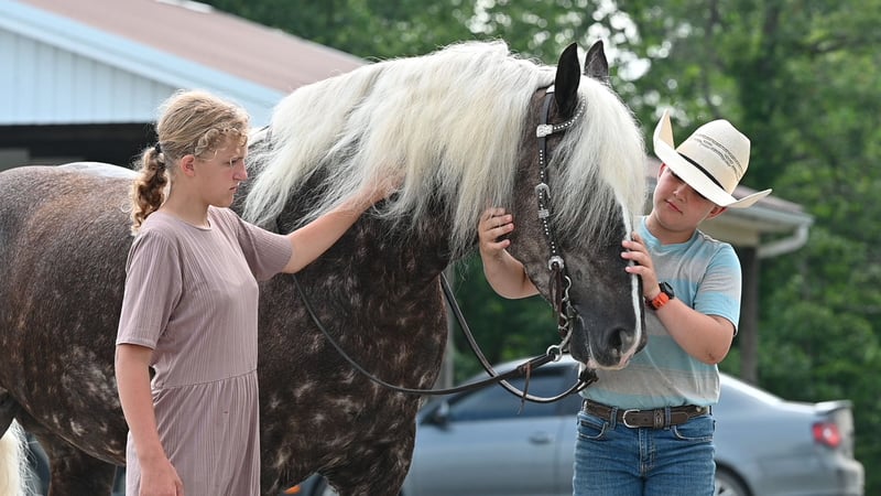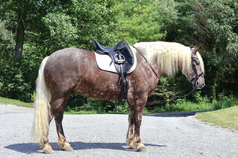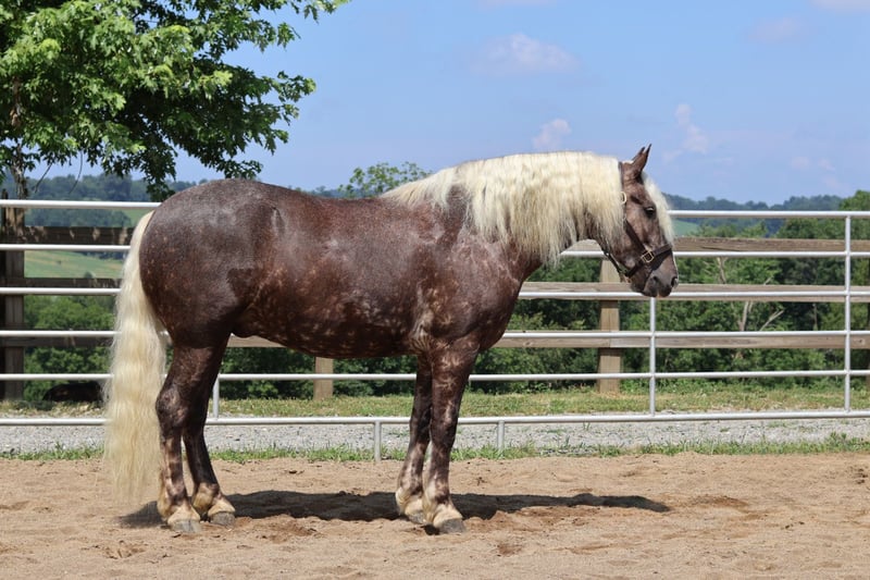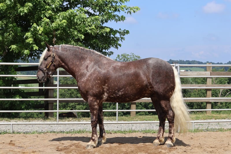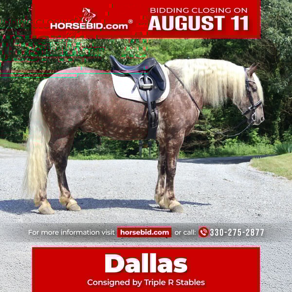 ⚜ The HERITAGE Classic ⚜ Happening now thru MONDAY | AUGUST 11th - Available EXCLUSIVELY on HorseBid's website! For more details and to register visit: www.Horsebid.com CONSIGNOR CONTACT: Triple R Stables 330-275-2877 LOCATION: Millersburg, OH BREED: 1/2Belgian 1/4Friesian 1/4Pony REGISTERED: Yes REGISTERED NAME: Dallas COLOR: Silver Chocolate HEIGHT: 16.1 AGE: 4 GENDER: Gelding Offered for sale.... Dallas – The Definition of Safe, Sound, and Special 📍 Breed: 1/2 Belgian × 1/4 Friesian × 1/4 Pony 📍 Height: 16.1H 📍 Weight: Approx. 1,300 lbs 📍 Age: 4yr.old 📍 Registered Gelding Meet Dallas – a one-of-a-kind gelding who checks every box: safe, quiet, gentle, and built to last. With his rare and eye-catching color , Dallas is as gorgeous as he is dependable. Whether you’re a beginner, a family adding to your herd, or someone looking for a calm, seasoned partner, Dallas is your guy. He’s the horse we trust with guests, kids, and riders of all experience levels. He’s been there, done that—trail rides, wagon trains, obstacle courses, water crossings, and more—and handles it all with a calm, steady attitude. 🌟 Dallas Rides & Drives! While he prefers a peaceful trail ride, Dallas also has a smooth walk, trot, and canter in the arena and will gladly go to work under saddle. He rides Western or English and adjusts beautifully to his rider’s level. To top it all off, Dallas drives—both single and double—and has had plenty of miles on the road, even in heavy traffic, with zero concern. He’s the kind of horse that adapts and shines no matter the job. 🛠️ Barn & Ground Manners: Easy to catch, load, bathe, clip, and shoe Ties quietly and respectfully Gets along well in the pasture 100% sound with no vices Dallas has up to date X-rays available to view! 💫 What Makes Dallas Special: Bombproof temperament Trail-safe, traffic-safe, obstacle-tested Steady and honest, with a heart of gold Smooth gaits + driving experience Great with riders of all levels Dallas is a true gentle giant with the mind, movement, and manners to be a once-in-a-lifetime partner. Whether you're looking for a quiet trail horse, or a versatile mount who also drives, Dallas delivers. He is a one of a kind gelding you don't want to miss out on! For more information or to schedule to come for a test ride, Contact Ray @330-275-2877