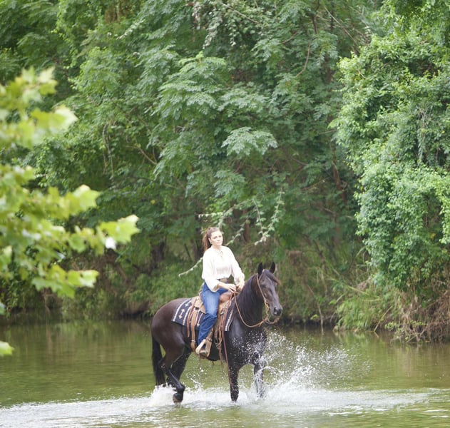 Toby is an elegant 15.3 coal black 2020 model, regsitered Fresian Sport Horse gelding schooling beautifully in the the dressage ring with tons of potential to carry you through the levels! Rides quietly in the arena or hacking out alone & in a group. Safe and easy for any level rider with simple transitions, changes, and gaits. Lofty and comfortable at the walk, trot, and canter with a soft mouth and moves around easy off leg. Toby rides outside, down the trails, across creeks, ditches, deadfall ect… he will ride around the ranch as well. He is a true gentleman in the stable to catch, groom, handle, saddle, mount, and ride. No silliness or vices of any kind.