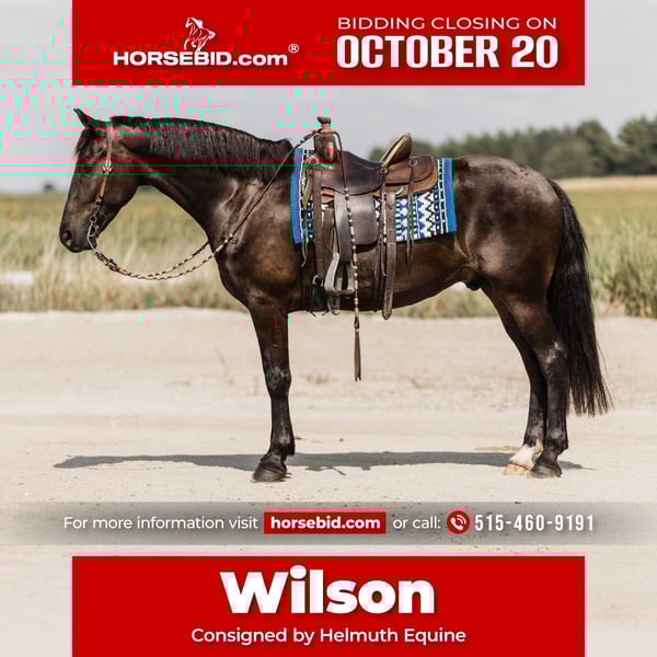 ♦️ 𝐭𝐡𝐞 𝐀𝐌𝐄𝐑𝐈𝐂𝐀𝐍 𝓕𝓪𝓵𝓵 𝓒𝓵𝓪𝓼𝓼𝓲𝓬 ♦️ Happening now thru MONDAY | OCTOBER 20th - Available EXCLUSIVELY on HorseBid's website! For more details and to register visit: www.Horsebid.com CONSIGNOR CONTACT: Helmuth Equine 515-460-9191 LOCATION: Ames, IA BREED: Friesian/Standardbred REGISTERED: No COLOR: Black HEIGHT: 16 AGE: 5 GENDER: Gelding Meet Wilson, a 5 year old, 16+ hand Friesian/Standardbred cross gelding. Wilson is a truly unique individual. He rides western on trails extremely well, he’ll lead or follow and is super brave and confident, making him suitable for any level of rider to enjoy out on the trail. We’ve taken Wilson to numerous XC schoolings, and he’s a real point and shoot type. As long as you have your connection right with him, he’ll take any jump, no matter how technical it is. He’s also been to several dressage shows, where he scored between 67% and 69% in T3 during his first summer out. Wilson drives exceptionally well in any form, whether it’s hooking a young horse beside him, driving in the wheel of a four in hand, or going single. He truly does it all. He has the talent, movement, and brain to easily progress up the levels in combined driving. He has a great canter and isn’t complicated. Yes, Wilson has a big motor and a touch of spice, just enough to give him that endless work ethic needed to excel in any discipline. Wilson has absolutely no vices whatsoever and no issues with his living situation. He’s an easy keeper, easygoing, and gets along well living outside with other horses or inside the barn. You can ride him every day or once a month and he’s always happy to go to work. Wilson would be ideally suited for a confident amateur or in a program. With his talent, the possibilities are endless on how far he can go.