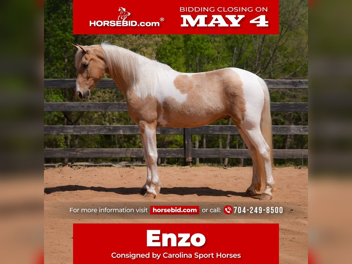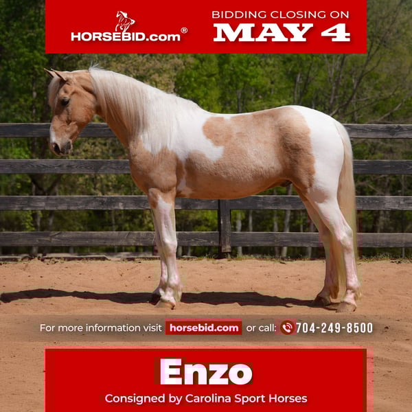 ▪️▫️◾️𝐭𝐡𝐞 𝑴𝒂𝒚 𝐒𝐞𝐥𝐞𝐜𝐭◾️▫️▪️ Happening now thru MONDAY | MAY 4th - Available EXCLUSIVELY on HorseBid's website! For more details and to register visit: www.Horsebid.com CONSIGNOR CONTACT: Carolina Sport Horses 704-249-8500 LOCATION: Clover, SC BREED: FRIESIAN X QH REGISTERED: No COLOR: PALOMINO PAINT HEIGHT: 15 AGE: 7 GENDER: Gelding ENZO is one of the horses you dream of working with. Every foot hits in the correct place. He is light on your hands and balanced in your legs. He is fun and brave for any level of rider. The great thing about Enzo is that he can tell when he has a beginner kid on him and when he has an experienced rider. He will adapt and perform at the level asked of him. In the barn he is a friendly horse that everyone loves to groom. He enjoys having his long mane and tail braided and brushed. He is excellent for the farrier and is shod on his fronts. He is never rattled or bothered by the other horses. In the pasture he is the lowest of the herd. He is on a 24/7 access to hay feeders and enjoys alfalfa as he desires it. He has never had any colic issues or medical issues. In the arena he is a dressage talent. He takes leg cues and has all the lateral moves. He is not just talented, he is fun. He always gets noticed and commented on everywhere we go. He loves to jump in and out of the ring. He isn’t scared of any water or jumps in front of him. On the trail is is quiet and brave. He has even finished in the top 3 of trail contest off property. He is happy to lead the rides or follow in the rear. He never panics or becomes concerned as the herd rides away. Why buy from us? The answer is simple. We have over 300 Horses sold and over 100 positive reviews across all platforms. People know we are a name you can trust. We have every horse inspected by a veterinarian prior to listing which we include in the videos. Carolina Sport Horses isn’t just an individual selling a family horse, we are a family training and selling horses monthly. We do not offer consignment and we own every horse. So we know the history and you aren’t buying someone else’s problems. WE KNOW ITS SCARY TO BUY ONLINE and welcome clients to come visit us in person. *All horses at CSH enjoy 24/7 turnout with a mixed herd when not in training. Training weeks they spend 3 days inside for work and 3 days off to relax. We do not feed grain but the horses to have 24/7 access to premium western alfalfa. All horses are up to date with vaccinations and worming. They are all on a 6 week farrier rotation as well and some are shod due to our rocky trails. We only train in a loose ring snaffle in western tack and a loose ring, French link or full cheek snaffle in English. Feel free to call or text me with any questions about horse care or training.