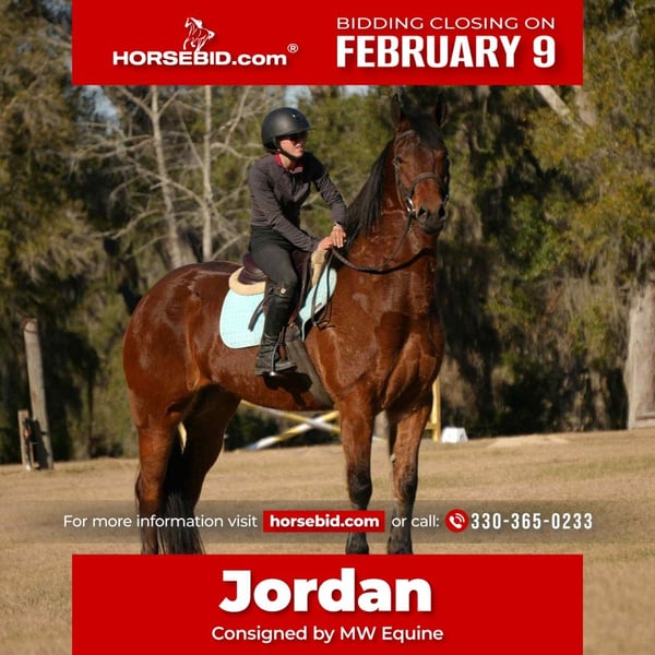 ❤️🔥𝑩𝒆 𝑴𝒊𝒏𝒆 𝐒𝐄𝐋𝐄𝐂𝐓❤️🔥 Happening now thru MONDAY | FEBRUARY 9th - Available EXCLUSIVELY on HorseBid's website! For more details and to register visit: www.Horsebid.com CONSIGNOR CONTACT: MW Equine 330-365-0233 LOCATION: Fresno, OH BREED: Friesian cross REGISTERED: No REGISTERED NAME: Jordan COLOR: HEIGHT: 16 AGE: 7 GENDER: Gelding Meet Jordan – Flashy 7-Year-Old Friesian Cross Gelding 16.0 HH | Bay | Athletic & Versatile Prospect Let me introduce you to the flashiest little bay horse around — Jordan! This handsome 7-year-old Friesian cross gelding stands a perfect 16 hands and is a true showstopper with his beautiful expression and presence. Jordan is a fun, versatile ride suited for an advanced rider or an intermediate adult looking for a flashy partner. He’s big enough for everyone to enjoy and has experience riding both English and Western. In the arena, he confidently walks, trots, and lopes circles with ease. He’s also proven himself to be a great partner around the farm and a fun trail horse. Jordan has been hauled to numerous arenas, trailers nicely, and stands well for the farrier. Out on the trails, he confidently crosses logs, navigates brush, and handles obstacles with a great attitude. Jordan has been introduced to cross country courses and absolutely loves it — showing confidence and enthusiasm. He would make a great prospect for someone interested in developing a cross country horse. Always up for adventure, Jordan enjoys trail rides, farm work, and relaxing Sunday rides down the back roads. He has an excellent foundation and has been under saddle for a few months now, riding very nicely. While he is not a finished horse, he is very well started and has tons of potential — making him a fantastic project for someone wanting to bring along a talented young gelding. Highlights: 7-year-old Friesian cross gelding 16.0 HH bay with flashy presence English & Western Walks, trots, and lopes in the arena Trail proven & obstacle friendly Introduced to cross country and loving it Hauled to multiple arenas Trailers well & stands great for the farrier No buck, bolt, or rear No bad habits Health: UTD on teeth, trims, Coggins, etc. Nationwide shipping available For more info, contact Marcus: 330-365-0233 Located in Fresno, Ohio