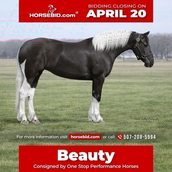 ⚜️𝐭𝐡𝐞 𝓔𝓵𝓲𝓽𝓮 𝐒𝐩𝐫𝐢𝐧𝐠 𝐂𝐥𝐚𝐬𝐬𝐢𝐜⚜️ Happening now thru MONDAY | APRIL 20th - Available EXCLUSIVELY on HorseBid's website! For more details and to register visit: www.Horsebid.com CONSIGNOR CONTACT: One Stop Performance Horses 507-208-5994 LOCATION: Oelwein, IA BREED: Friesian Sport Horse REGISTERED: Yes REGISTERED NAME: Beauty COLOR: Black & White HEIGHT: 15.2 AGE: 4 GENDER: Mare This mare is an absolute gem of a horse and her barn name, Beauty, matches not only her looks but her endearing personality. Breeder owned and raised, you can see the thought, time and care that has gone into her. She is sired by a Reg Friesian stallion and out of a Reg APHA mare, and is the epitome of what a sport horse should be. Standing right at 15.2hh with flawless conformation, striking color, and the perfect amount of bone and substance along with the prettiest kind eyes. This is one of those horses I cannot say enough about and honestly cannot fault her in any way. She is truly remarkable. Not only is Beauty still owned by her breeder, she has also been in consistent training with the same trainer for the past year developing a rock solid foundation under saddle both in and out of the arena. She is soft in the face and throughout her body. Will lope/canter right on cue, side passes, pivots, will ride on contact or stay consistent and level headed on a draped rein, and has a very correct and beautiful way of moving. Beauty is smooth, comfortable and very uncomplicated to ride. English, western, or bareback, and stays the same consistent reliable mount for any and all riders placed on her. She has logged countless miles outside the arena as well navigating trails, water crossings, quiet country roads or busy traffic in town or on the highways both on solo rides or in a group. And on top of all of that, she is also well broke to drive for anyone to take to town for a fun afternoon. This mare is an absolute joy in every way, and is a favorite for anyone who gets the opportunity to ride or drive her. On the ground Beauty is an absolute doll. The kind of horse that is a blessing to have in your barn. She is kind, quiet, patient, has phenomenal manners, and never causes a fuss in any way. She stalls beautifully, loads and hauls like a seasoned pro, cross ties, bathes, clips, and is great for the vet and farrier. Easy to turn out and blend with any herd, and great with all other horses whether riding in a crowded arena or on the ground in a crowded barn. She is just a joy in every way. Very easy keeper, always sound and healthy, requires no extra maintenance or special care of any kind. She is UTD on all cares including dental, farrier and coggins. She does have her registration paperwork currently in order with the Friesian Sport Horse registry that will either accompany her with her travels to her new home or be mailed should they arrive in the mail after the auction ends. Please be sure to watch her entire sale video. It shows her riding western, dressage, in a snaffle in a curb bit, by 4 different riders, including a 12yr old boy, carrying the flag, trails, driving, and bareback. Beauty is truly a rare find of a horse with a whole lifetime ahead of her and endless possibilities. **One Stop Performance Horses is acting as Seller’s Agent for the owner**