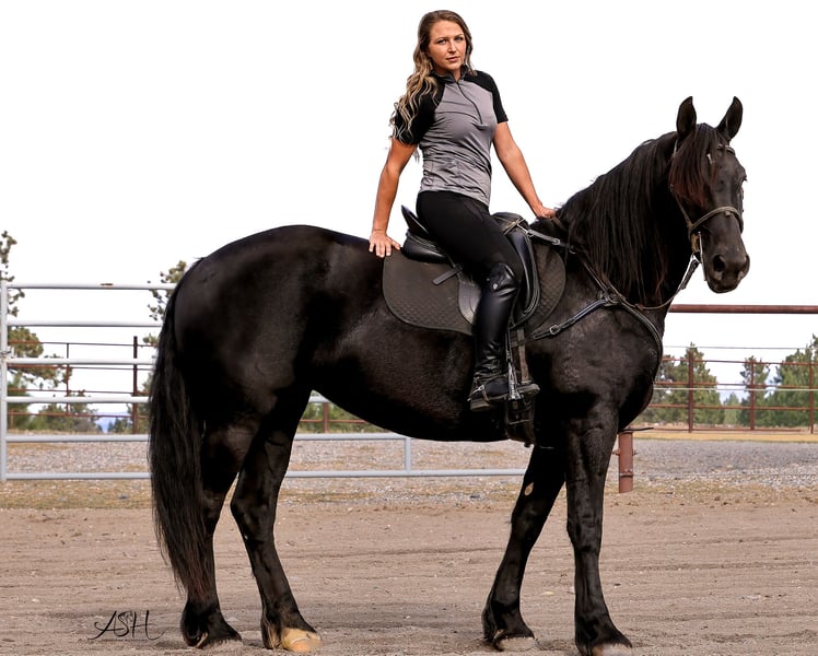 🎄𝐓𝐇𝐄 𝑯𝒐𝒍𝒊𝒅𝒂𝒚 𝐂𝐋𝐀𝐒𝐒𝐈𝐂🎄 Happening now thru MONDAY | DECEMBER 15th - Available EXCLUSIVELY on HorseBid's website! For more details and to register visit: www.Horsebid.com CONSIGNOR CONTACT: Miller Horses 406-380-1154 406-200-5039 LOCATION: Billings, MT BREED: Friesian Sport Horse Registry REGISTERED: Yes REGISTERED NAME: Sky View's Faith COLOR: Black HEIGHT: 15.3 AGE: 5 GENDER: Mare SKY VIEWS FAITH – 2020 FSHR Black Mare BY - Tetrino Van Het Kasteel x Jasper 366 Out of - R.A.M.’s Polly x Percheron Bred and raised right here at Miller Family Horses in Moore, Montana. She’s half Friesian, half Percheron—a good mix of elegance and strength. Faith is as gentle as they come, always first to the gate with a calm, steady way about her. She’s been around cattle, crossed water, and handled busy days without batting an eye. She drives well in single hitch, with plenty of experience from wagon rides and ranch chores. Under saddle, she’s lovely and coming along nicely, responsive to leg cues, picking up leads, and moving smooth through her walk, trot, and canter. She’s been used at the stockyards and has experience around cattle. On the ground, she’s easy to handle—good for the farrier, takes a bath no problem, and stands quiet for the mounting block. She’s an easy keeper, too. Faith is a solid mare, good-looking and reliable, a true product of our breeding program. She would make a great family, trail, dressage, or a super fancy ranch horse. FMI: Call 406-380-1154(can NOT receive text) send Text messages to 406-200-5039