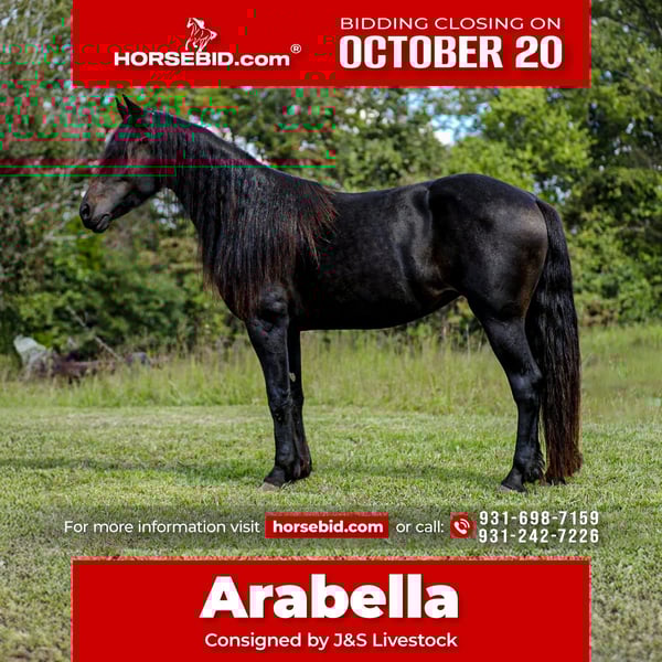♦️ 𝐭𝐡𝐞 𝐀𝐌𝐄𝐑𝐈𝐂𝐀𝐍 𝓕𝓪𝓵𝓵 𝓒𝓵𝓪𝓼𝓼𝓲𝓬 ♦️ Happening now thru MONDAY | OCTOBER 20th - Available EXCLUSIVELY on HorseBid's website! For more details and to register visit: www.Horsebid.com CONSIGNOR CONTACT: J&S Livestock J.T. 931-698-7159 or Bailey 931-242-7226 LOCATION: Santa Fe, TN BREED: Friesian Sport Horse REGISTERED: Yes REGISTERED NAME: Arabella COLOR: Black HEIGHT: 15.1 AGE: 8 GENDER: Mare Arabella, a 2017 model registered Friesian Sport Horse mare standing 15.1 hands tall is the true definition of beginner safe, and a true sweetheart! If you are looking for a safe, dependable and drop dead gorgeous mare you can count on to be the same horse every single day, then Arabella would fit perfectly into your program. We have trail rode her extensively and have had many different levels of riders on her back, who all have thoroughly enjoyed their time with her. Take her through the water, cross fallen down trees or take her up or down a steep incline- wherever you point her is where she’ll go. She has that naturally gentle, kind demeanor literally anyone would be able to get along with. Shes calm and levelheaded, sure footed and most of all safe for anyone looking for a beautiful, kind mare that’s trustworthy. She stands perfectly to be tacked and mounted, loves a bath and to be groomed on as well. She does well being turned out or stalled. We truly can’t say enough good things about this mare. She has a current coggins and a recent PPE. We’d love to talk to anyone interested in Arabella- call or text Bailey 931-242-7226 or J.T. 931-698-7159