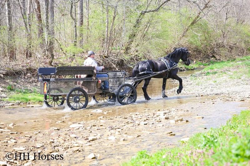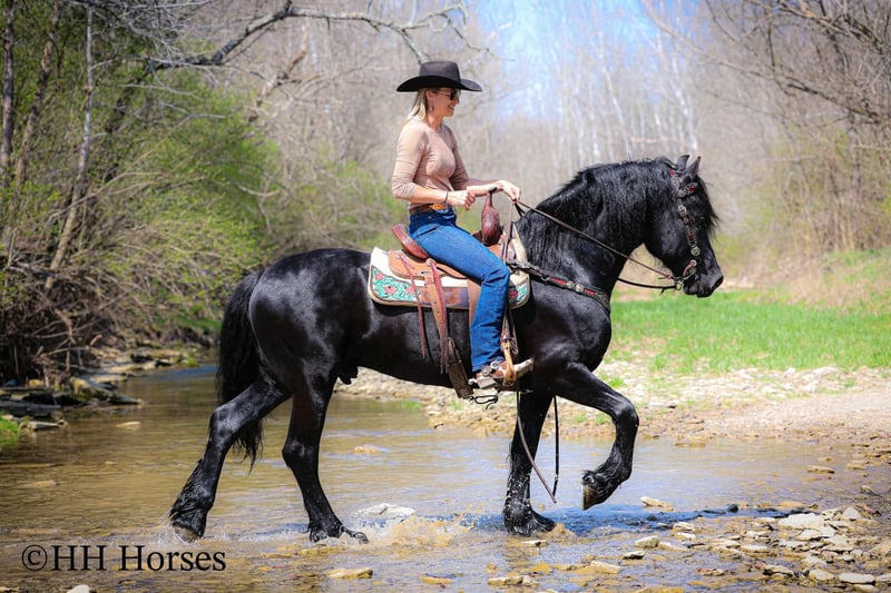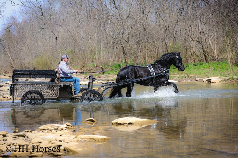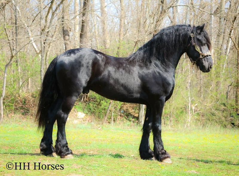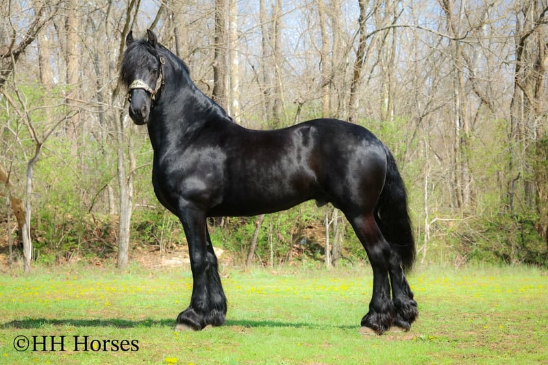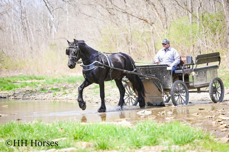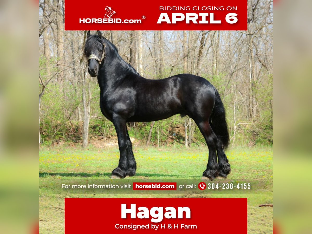 🌟𝑨𝒑𝒓𝒊𝒍 𝐀𝐋𝐋 𝐒𝐓𝐀𝐑 𝐋𝐈𝐍𝐄𝐔𝐏🌟 Happening now thru MONDAY | APRIL 6th - Available EXCLUSIVELY on HorseBid's website! For more details and to register visit: www.Horsebid.com CONSIGNOR CONTACT: H & H Farm 304-238-4155 LOCATION: Flemmingsburg, KY BREED: Friesian REGISTERED: Yes REGISTERED NAME: This is Hagan COLOR: Black HEIGHT: 15.2 AGE: 8 GENDER: Stallion This is "HAGAN", the best, most gentle, well broke, civilized PUREBRED REGISTERED FRIESIAN STALLION that is broke to ride and drive. He is registered with the KFPS. He stands 15.2 hands tall and is 8 years old. This is one of the nicest FRIESIAN STALLIONS that I have ever been around. He is easy to handle, a true gentleman, and can be ridden and driven around other mares and geldings with no issues. He has impeccable ground manners for a stallion, he is obedient, and he aims to please under harness or tack. He has been driven in the hitch classes and shown, been through the cross country driving courses, and been driven to town. He is traffic safe, not spooky, and he rides confident out alone. He is a super trail horse that is sure footed, solid, and honest. He loves attention, he is personable, and likes to go for trail rides. He will cross deep water without hesitation, handle steep terrain with no issues, and walks out nicely on a loose rein. This stallion has lots of action, he is easy to ride or drive, and he is super comfortable. He has a nice lope, he will work a circles, he will catch his leads, and stop easily. He backs up and moves off of leg cues. He stands tied quietly, he loads, bathes, and hauls with ease. He is an exceptional stallion that is a purebred with a head full of sense. He is an easy breeder that has been pasture bred and hand bred. He can be hauled next to other horses without any problems.