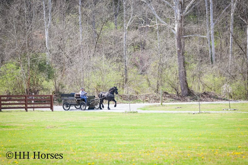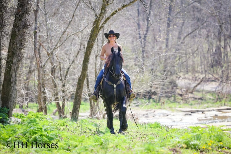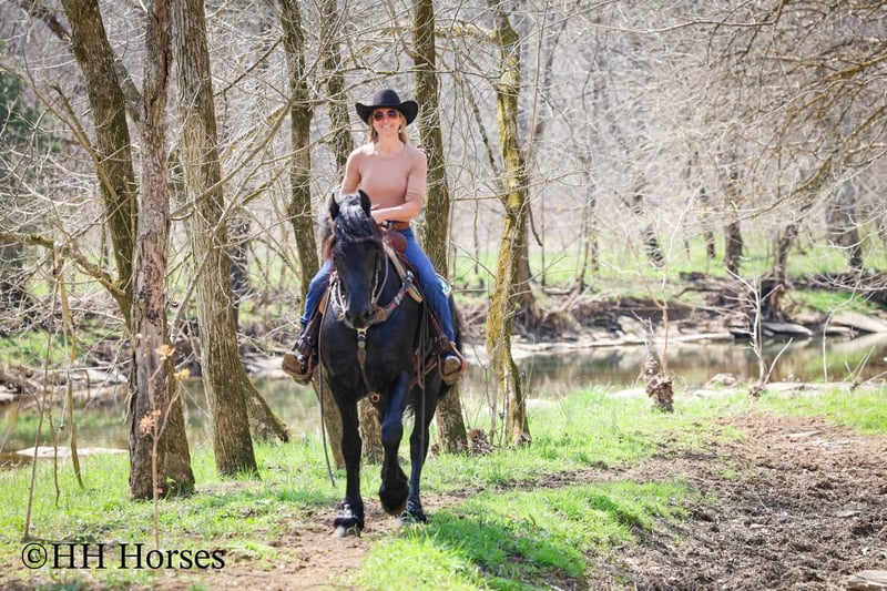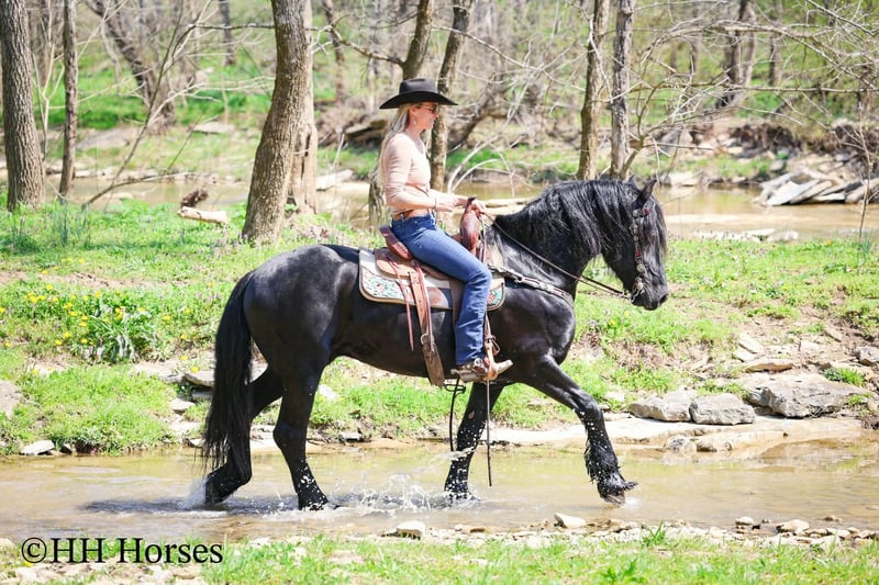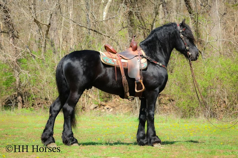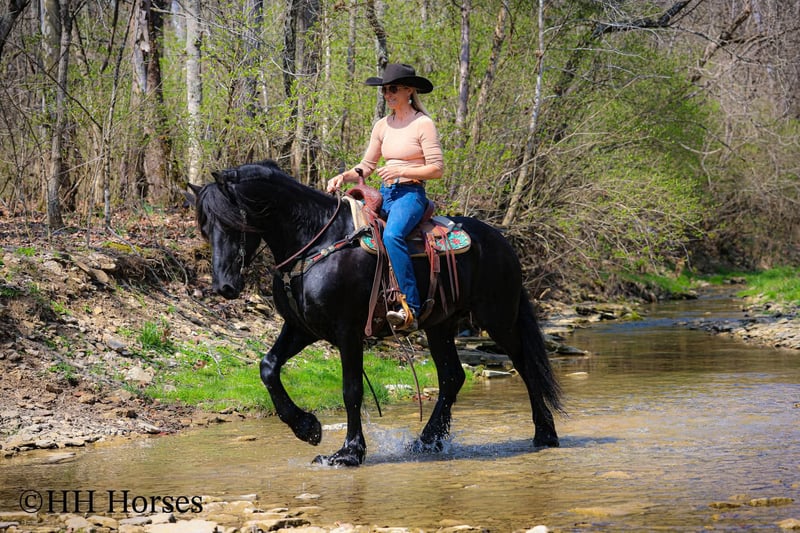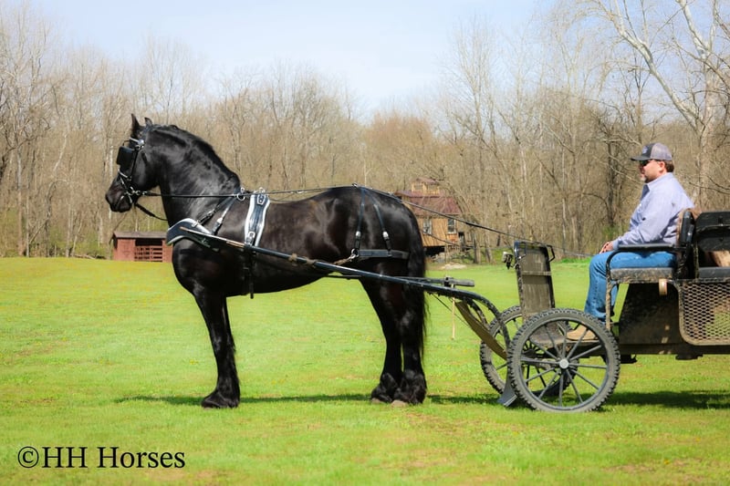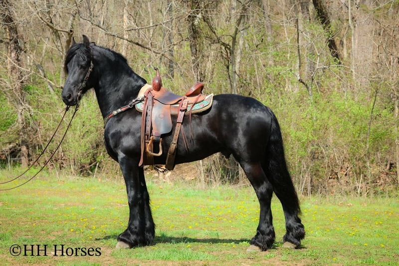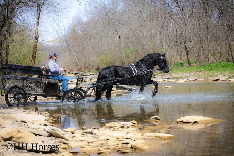 🌟𝑨𝒑𝒓𝒊𝒍 𝐀𝐋𝐋 𝐒𝐓𝐀𝐑 𝐋𝐈𝐍𝐄𝐔𝐏🌟 Happening now thru MONDAY | APRIL 6th - Available EXCLUSIVELY on HorseBid's website! For more details and to register visit: www.Horsebid.com CONSIGNOR CONTACT: H & H Farm 304-238-4155 LOCATION: Flemmingsburg, KY BREED: Friesian REGISTERED: Yes REGISTERED NAME: This is Hagan COLOR: Black HEIGHT: 15.2 AGE: 8 GENDER: Stallion This is "HAGAN", the best, most gentle, well broke, civilized PUREBRED REGISTERED FRIESIAN STALLION that is broke to ride and drive. He is registered with the KFPS. He stands 15.2 hands tall and is 8 years old. This is one of the nicest FRIESIAN STALLIONS that I have ever been around. He is easy to handle, a true gentleman, and can be ridden and driven around other mares and geldings with no issues. He has impeccable ground manners for a stallion, he is obedient, and he aims to please under harness or tack. He has been driven in the hitch classes and shown, been through the cross country driving courses, and been driven to town. He is traffic safe, not spooky, and he rides confident out alone. He is a super trail horse that is sure footed, solid, and honest. He loves attention, he is personable, and likes to go for trail rides. He will cross deep water without hesitation, handle steep terrain with no issues, and walks out nicely on a loose rein. This stallion has lots of action, he is easy to ride or drive, and he is super comfortable. He has a nice lope, he will work a circles, he will catch his leads, and stop easily. He backs up and moves off of leg cues. He stands tied quietly, he loads, bathes, and hauls with ease. He is an exceptional stallion that is a purebred with a head full of sense. He is an easy breeder that has been pasture bred and hand bred. He can be hauled next to other horses without any problems.
