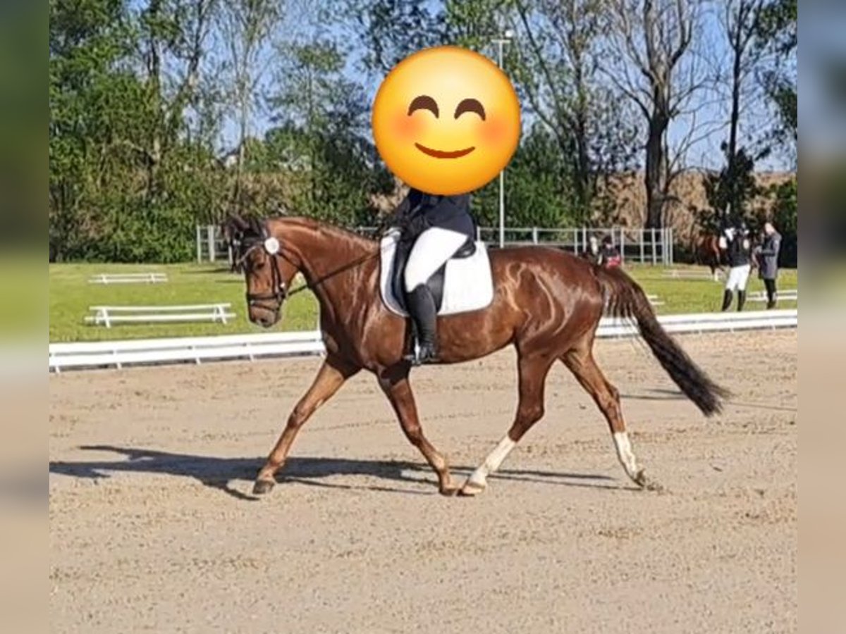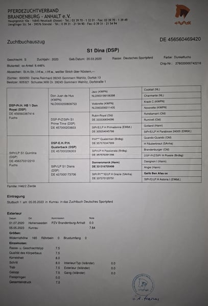 For sale is a 6-year-old mare (height at 16.1 hh) who impresses with her friendly and uncomplicated nature in daily handling. She is very personable, well-behaved during handling, and confident in loading. She also handles being alone for short periods, such as while grazing, without any issues. By Don Royal (sire) out of a Quarterback (dam), she carries excellent dressage-oriented genetics. She is registered in the stud book and has received consistently good evaluations, with scores of 7.5 to 8 in movement and conformation. Training-wise, she is at a solid L-level and has already been successfully presented in dressage horse tests at class L competitions. Under saddle, she is motivated, eager to perform, and shows great potential for further development. However, she should be ridden by an experienced rider, as she can sometimes react sensitively and respond quickly. She is always honest and does not buck, but she requires a confident and calm rider. Currently, she is not suitable as a children's riding horse and has not been fully tested in traffic, as she can be startled by fast-moving cars. An excellent mare for an ambitious rider seeking a talented young horse with good pedigree and promising prospects.