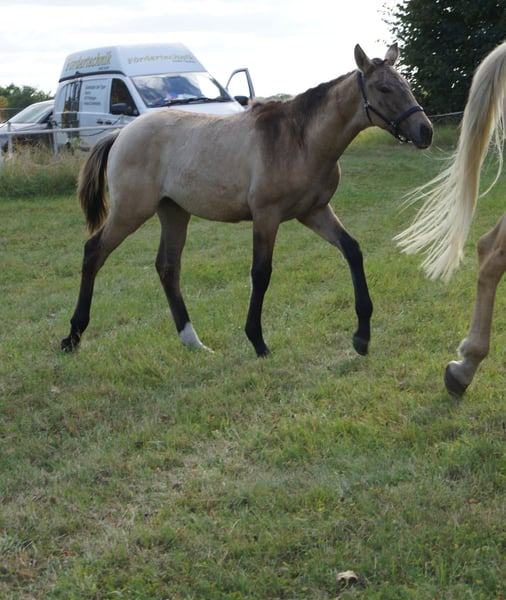 Diese ganggewaltige Dame überzeugt nicht nur mit ihrem ruhigen und menschenbezogenen Charakter, sondern auch mit ihrer Genetik. In ihr stecken gleich 2 Ausflhellungsgene dh einmal das Creme-gen und des weiteren Dun-genetik dh sie ist ein echter Falbe mit Alstrich auf dem Rücken und Zebrastreifen an den Beinen ( nennt sich Dunskin dh Buckskin und Falbe in einem). Außerdem glänzt sie mit einem tadellosen und überaus korrektem Körperbau und steht auf kräftigen , gesunden Beinen. Dies hat sie ihren Eltern zu verdanken da ihr Vater kein anderer als der auf Grand Prix Niveau laufende Lusitanohengst Inefavel ist. Dieser ist sogar erst kürzlich im Oldenburger Verband anerkannt worden und besticht nicht nur durch seine einzigartige Optik, sondern bringt auch die nötige Härte und Robustheit mit die in der modernen Sportpferdezucht in den Hintergrund gerutscht ist ohne dabei an Bewegungspotenzial zurück zu stecken. SeineNachkommen glänzen alle in Qualität sowie Ausstrahlung und entsprechend ist es nicht verwunderlich dass die kleine Ballerina auch eine überdurchschnittliche Bewertung vom Verband erhielt und sich Prämienfohlen nennen darf. Mütterlicherseits trifft kopfklare vielseitige tschechische Linie auf das heißbegehrte Blut vom Stempelhengst Quarterback- die daraus entstandene Mutterstute von der kleinen Bewegungskünstlerin zeigt ihrem Fohlen wie entspannt der Umgang mit der Umwelt und den Menschen sein kann und entsprechend war die Zeit des Lernens vom Fohlen ABC eine leichte Übung. Sie kennt alles was man so kennen muss dh Führen, Putzen, Anbinden und Hufe geben sind kein Problem und da wir nur 2 Großpferdefohlen im Jahr aufziehen hat sie auch genügend Familienanschluss in ihrem jungen Leben erfahren dürfen. Geburt und Aufzucht waren bisher absolut Komplikationslos und sie durfte mit viel Bewegung auf unterschiedlichen Untergründen aufwachsen. Das heißt konkret dass sie die ersten 3 Tage mit Mama in einer 4x6m Außenbox untergebracht war und anschließend 24h/Tag das Tor geöffnet ist und die Koppelzeit mit einer weiteren Mutterstute und ihrem Fohlen genießen darf. Das heißt aber auch dass sie trotz Unterstand auch jede Witterung kennengelernt hat. Tausch oder Inzahlungnahme gegen tragende Zuchtstute (Rappe oder Sonderfarbe) möglich