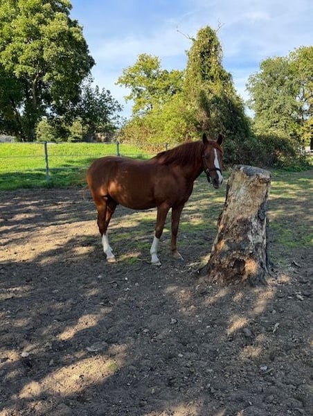 For sale: German Riding Pony gelding, born in 2015, chestnut, 14.1 hh This charming German Riding Pony gelding, born in 2015, is a true eye-catcher with his friendly nature and attractive chestnut coat. Standing approximately 14.1 hands, he is ideally suited for dressage. The gelding is well-trained with a solid foundation in dressage. He demonstrates smooth, well-ridden basic gaits and is a reliable partner for both ambitious leisure riders and young talents. Thanks to his balanced temperament and willingness to learn, he is also suitable for novice riders looking to develop their dressage skills. His well-maintained condition and friendly demeanor make him an ideal companion for daily training, competitions, and recreational riding. If interested, we look forward to hearing from you to discuss further details and arrange a test ride. A fee of €15 applies for the test ride, which goes towards the pony’s care (carrots, apples, and muesli included).