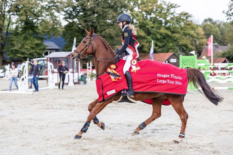 GERMAN JUMPING PONY - GRAND PRIX – EM – PART OF FAMILY Jango hat mit Tochter Viktoria gerade sein letztes Turnier bestritten und noch einmal seine ganze große Klasse gezeigt. Die Beiden waren als Mitglied des deutschen Bundeskaders für das grosse Hallenchampionat in Aachen nominiert. Im Finale am Sonntag zeigte Jango sein enormes Potential für die wirklich hohen Springen, fehlerfrei im Umlauf, fehlerfrei im Stechen mit einer überragenden Zeit. Nur Mini Voss aus Holland konnte Vicky mit Jango letztendlich knapp den Sieg abringen. Pony Jango hat sich mit seiner jungen Reiterin bis in die höchsten Springevents hochgearbeitet, hatte auf diesem Niveau noch keinerlei Erfahrungen mit der Vorbesitzerin. Es gab Höhen und (seltene Tiefen), die Beiden haben sich nie beirren lassen, sich immer gemeinsam weiter entwickelt und letztendlich ihr Können gerade noch einmal in Aachen gezeigt. Mit entsprechend engagierter Reiterin/Reiter ist mit Jango im Ponyspringsport ALLES zu erreichen. Jango hat reichlich Go, eine riesige Gallopade und ist mit FEI 149cm im ehrlichen Pony-Endmaß. Erfolge sind zahllos, alleine in 2024: 9 Siege in der höchsten Ponyklasse 120-135cm. Sieger Finale deut. Meisterschaften 2024, Nr. 1 der deutschen Springponys im rimondo ranking 2024, Sieger der nationalen HGS Ponytour Large. Mehrfach platziert in internationalen GrandPrix‘. Fehlerfrei im Nationenpreis Umlauf bei den Europameisterschaften 2025 Le Mans, fehlerfrei Umlauf und Stechen ‚kleines Finale‘ EM le Mans. Jango ist ein unheimlich intelligenter Typ, verspielt, ein Traumpartner zum Liebhaben und zum Schleifen sammeln! Jango geben wir nur in allerbeste Hände. Platz vor Preis!