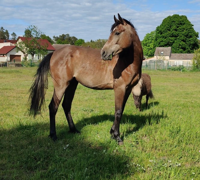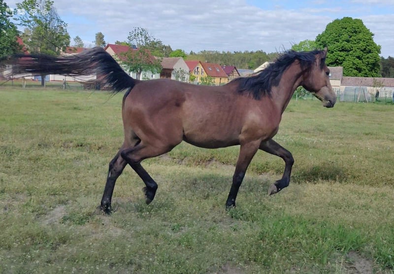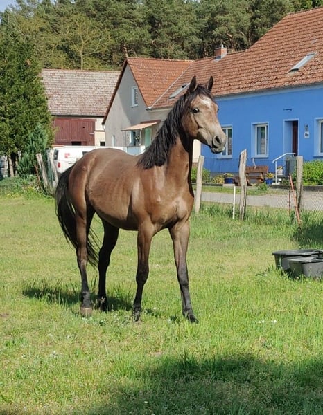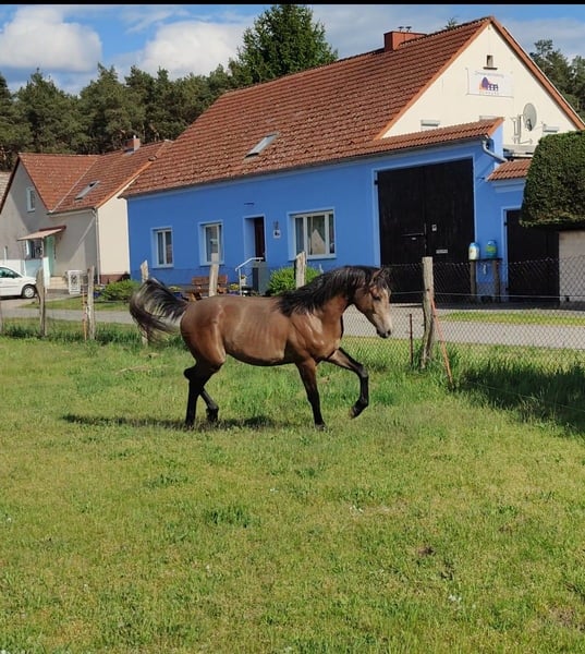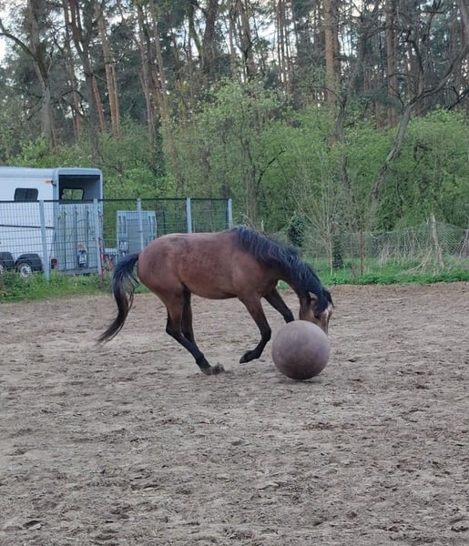 Zum Verkauf steht ein wunderschöner Reitpony Wallach namens Ares. Er ist im Jahr 2023 geboren. Er stammt von einer Springlinie ab, wie man an seinem Vater sieht. Er hat als Vater Askari den erfolgreichen Holsteiner Springvererber. Das letzte Bild ist ein Halbbruder von Ares im Alter von 2.5 Jahre, dieser hatte einen Dressurvererber als Vater und zeigte dennoch großes Talent beim Springen. Der Halbbruder (verkauft) wird nur gezeigt, um einen Eindruck der Mutterstute zu vermitteln. Über die Mutter (ox) kommt Lauffreudigkeit und Ausdauertalent mit, eine gute Grundlage für die Vielseitigkeit. Ares zeigt eher nicht das typische Araberverhalten, sondern eher das des Warmblüters. Mit einem Stockmaß von derzeit ca. 159 cm deckt er groß und klein optimal ab, also ein Pferd für die ganze Familie. Dieser liebevolle und gut erzogene Wallach wird sich hervorragend als Familienpartner entwickeln. Er ist sehr verspielt und zeigt eine große Lernbereitschaft und möchte mit seinen Menschen etwas unternehmen. Er ist bei uns geboren und ist familiär aufgezogen worden. Er ist daher sehr menschenbezogen und ist den täglichen Umgang mit Menschen gewöhnt, also nicht auf einer Koppel "verwildert". Er ist unter Pferden ebenfalls gut sozialisiert und ist im Herdenverband mit Stuten und Hengst aufgewachsen. Er weiß wie man sich in einer Herde verhalten muss. Regelmäßig geimpft und beim Hufschmied vorgestellt. Halfterführig und weiß sich zu benehmen. Beste Voraussetzungen, um ab Herbst/Frühjahr mit seiner Ausbildung zu beginnen. Bei Interesse oder weiteren Fragen zu Ares stehe ich Ihnen gerne zur Verfügung. Besuchen Sie uns und lernen Sie diesen tollen Wallach persönlich kennen! Er könnte schon bald Ihr zukünftiger treuer Freizeitpartner sein.