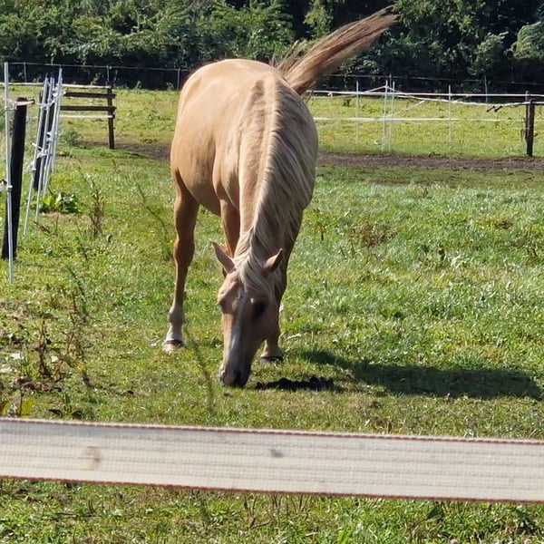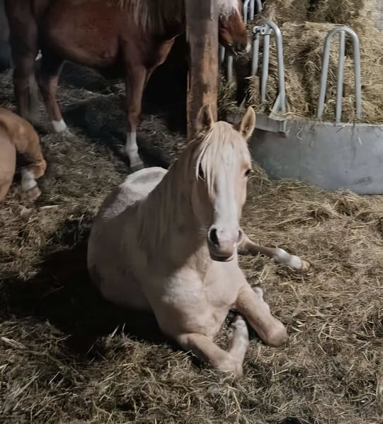 Oddajemy naszego spokojnego i przywiązującego się do człowieka konia w dobre ręce. Ma 3 lata, przewidywana końcowa wysokość około 1,45 m, jest palomino z białymi znakami i jest absolutnie uroczy. Jest bardzo łagodny i obecnie mieszka w stadzie mieszanym z ogierami i wałachami. Tam wykazuje się dużą zgodnością i przyjaznym usposobieniem. Jest bardzo towarzyski, uwielbia głaskanie, jest spokojny podczas czyszczenia kopyt i zna procedurę załadunku do przyczepy. Do tej pory wykazuje dużą współpracę i chęć zrobienia wszystkiego poprawnie, jest łatwy w obsłudze i przyjazny. Uważamy, że będzie się dobrze nadawał do dyscyplin takich jak ujeżdżenie, skoki przez przeszkody oraz teren, ponieważ jest bardzo odważny, nieustraszony i mocny nerwowo. Pod względem charakteru bardzo przypomina swoją pełną siostrę, która odnosi sukcesy w ujeżdżeniu na poziomie L, a także w skokach na poziomie E (możliwość rozwoju na wyższych poziomach, ale nie jest to obecnie promowane) oraz jako niezawodne koń terapeutyczny. W rodowodzie posiada słynnego ogiera Deinhard B. W razie pytań chętnie służymy pomocą pod numerem 0173-1808020.