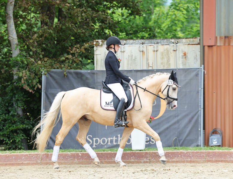 Djulyo was only backed at a later age due to his size and has only been more intensively trained in the past six months. He has just competed in his first competition and came home with a ribbon. He even knows team riding and enjoys trailering. An ideal pony for small adults or experienced teenagers with a gentle hand. He is currently at a secure A-level but has little enthusiasm for riding. He prefers to be ridden only 2 to 3 times a week and loves groundwork or tricks the most. He is very intelligent, learns quickly, and always wants to try something new. Not suitable for those seeking a boring ride, but for someone looking for a challenge. Just one trial ride won't do with him, as he initially doesn't like strangers... You need to visit several times and, best of all, spend time with him—not just get on and off, because HE chooses his rider... He was in a stallion group until age 4 with 24/7 turnout on pasture, then in a group with four mares, and is now currently in a box. He can easily be turned out 24/7 and enjoys being outside. He has always been barefoot. His family lives nearby; he was bred by me, and his 29-year-old grandmother is still in great shape. He is looking for his soulmate, someone where he can stay forever. Price is secondary... for him, it has to be the right fit, and that's not easy. At three years old, he was health-checked without any findings; he receives annual dental and osteopathic care.