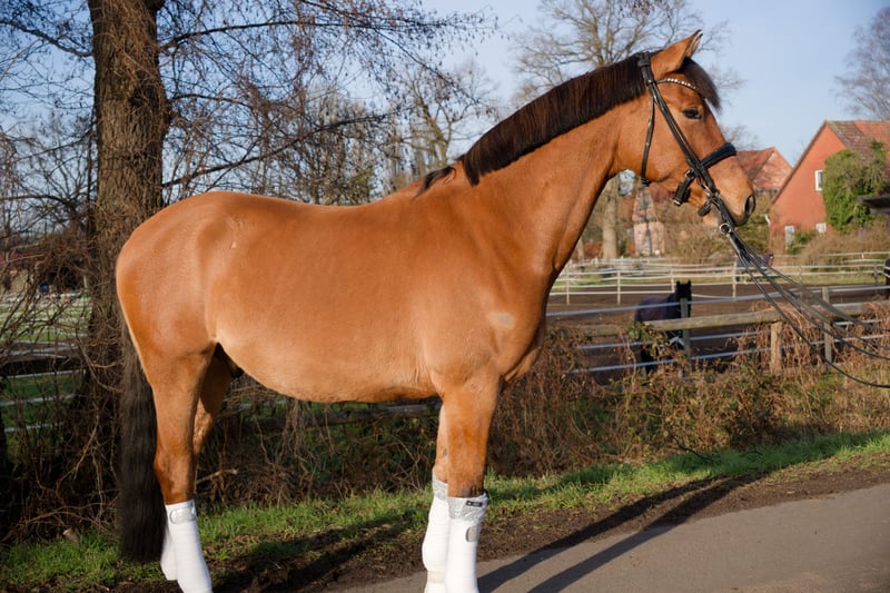 For sale is the expressive pony gelding Morgensterns D’Artagnan, nearly 8 years old, in a special bay color with a height of 1.53 m. He combines quality, presence, and willingness to work. "Darti" was licensed as a stallion at the age of 3 (2021) in Elmshorn, highlighting his excellent movement, breeding quality, and outstanding conformation. At 5 years old, he was gelded and is uncomplicated in handling with mares. "Darti" is a son of the exceptional sire FS Don’t Worry, renowned for rideability, excellent basic gaits, and sporting ambition. His dam is FS Carmelita, a daughter of the elite sire FS Champion de Luxe, who as Bundeschampion has produced numerous licensed sons, state premium mares, and successful sport horses. He is a full brother to Steendieks Morgensterns Dalai, a highly decorated stallion with Bundeschampionship placings and successful progeny – a clear testament to the quality of this lineage. "Darti" boasts very good basic gaits, with his outstanding walk particularly noteworthy – rhythmical, expressive, and of high quality, making him well-suited for further dressage training. In sport, he has achieved a placement in Dressage Horse Class A and is currently competing at L-level. He is motivated, eager to learn, and willing to perform but requires an experienced, confident rider. Not suitable for beginners or timid riders, but ideal for ambitious young riders or experienced equestrians. In daily handling, he is well-behaved, shoe- and loading-traffic safe. He is barefoot, fully vaccinated, and regularly dewormed. A 2023 health check (AKU) with no findings, including X-rays of legs and back, is available. Currently, he is housed in a mixed group during the day and kept in a box at night, but he also knows pasture 24/7 in summer – social and herd-friendly. A licensed-quality pony with XXL size, a special color, excellent basic gaits, sporting potential, excellent pedigree, and very good health status – a true eye-catcher with potential.