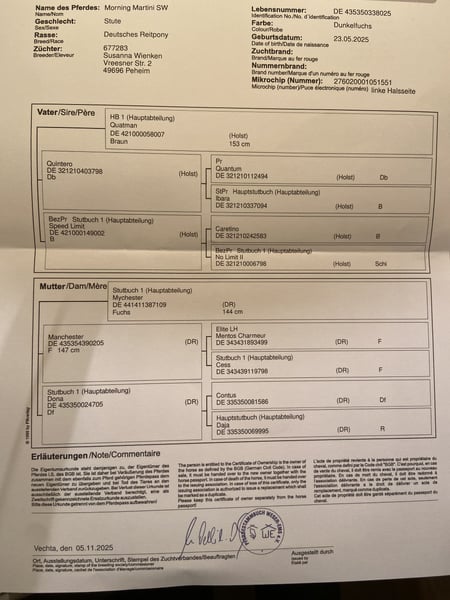 Zum Verkauf steht ein prämiertes Deutsches Reitpony-Stutfohlen von Quatman x Manchester, geboren am 23.05.2025. Sie stammt aus zwei charakterstarken, verlässlichen Eltern: Der Vater war bis 1,30 m platziert und trug Kinder sicher bis zur Deutschen Meisterschaft, selbst während der Decksaison erfolgreich und brav im Einsatz. Die Mutter wurde nie gefördert, überzeugt aber mit einem Herzen aus Gold, Aufmerksamkeit und Ruhe. Das Fohlen zeigt schon jetzt viel Vermögen, ist sehr mutig, aufgeschlossen und ausgesprochen menschenbezogen. Sie kommt freundlich auf jeden zu, liebt Zuwendung, ist halfterführig, gibt brav alle Hufe und verhält sich beim Hufschmied vorbildlich. Ein hochversprechendes, prämiertes Nachwuchspony mit großem Potenzial und besten Charakteranlagen. Aufgrund ihres “gos” und ihres mutigen Charakters, kann ich sie mir sehr gut im Springen oder der Vielseitigkeit vorstellen! Das Potenzial für den gehobenen Ponysport bringt sie auf jeden Fall mit! Standort: 49696 Peheim Preis: 5.000€