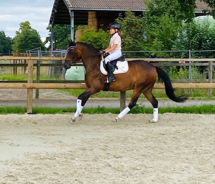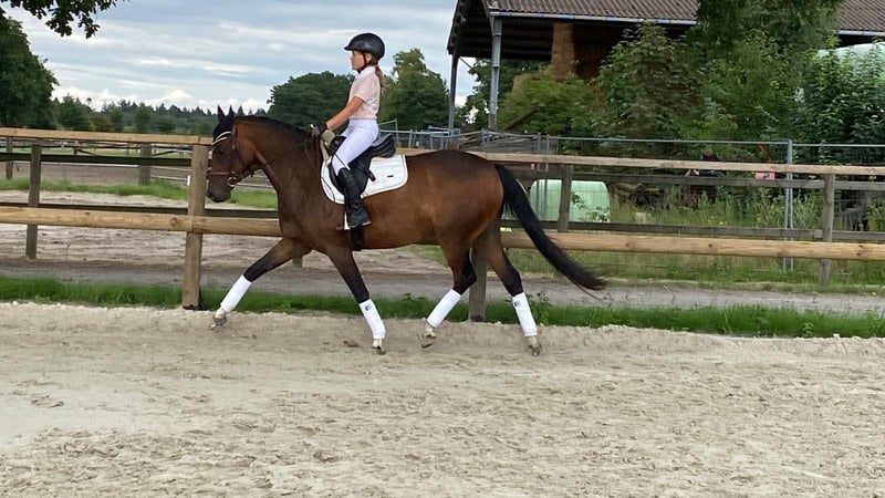Directly from the breeder! This very elegant mare, in the ideal pony size, is ready for new challenges! Lady was raised with us and was lightly backed at the age of three. During the winter, she enjoyed a well-deserved break, as is customary here, before returning to work in May. She has three beautiful basic gaits and shows plenty of enthusiasm and engagement during her first small jumps under saddle. Her talent and excellent manners are already evident when free jumping. Lady is very easy to ride, even for young riders, both in the arena and in the field. She is worked in a variety of disciplines, including groundwork, dressage, jumping, and trail riding. Young riders will have a lot of fun with her! Of course, at her age, she is not yet fully established, but with proper support from the ground, nothing stands in the way of her competing from 2026 onward. We wish for her a wonderful family that will appreciate her loving nature. Her siblings are very successful in sport up to FEI level, including S-Dressage, L-Show Jumping, and driving. The dam line also includes Bundeschampions in eventing. She is open to all disciplines.