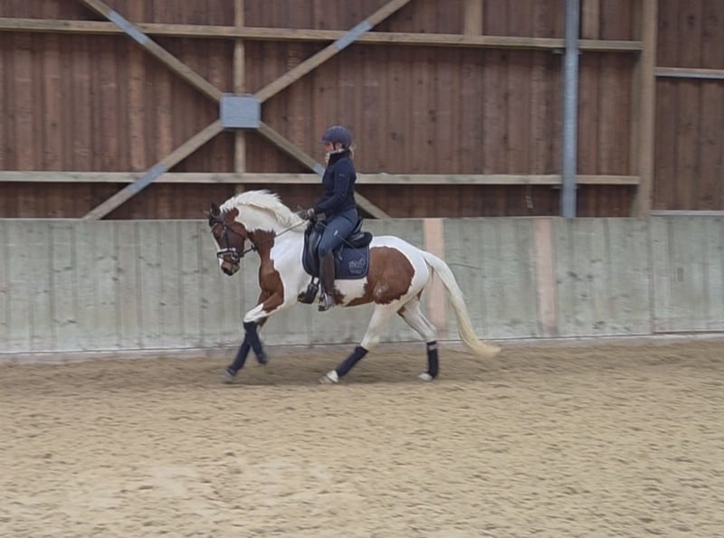 Farbenspiel ist eine bezaubernde vierjährige Tochter des dressur-erfolgreichen S** Für immer Du aus einer Mondprinz-Mutter. Sie verfügt über drei gute Grundgangarten und hohe Rittigkeitswerte. Sie möchte jeden Tag gefallen und hat von Anfang an nie einen falschen Schritt gemacht. Farbenspiel lernt unglaublich schnell, ist stets motiviert und besitzt trotz ihres noch jungen Alters eine beeindruckende Coolness. Sie wurde mit drei Jahren schonend angeritten und durfte dann von Juni bis Dezember noch einmal auf der Weide reifen. Seit Anfang Januar ist sie wieder unter dem Sattel und hat in kurzer Zeit gezeigt, dass sie nichts verlernt hat. Im täglichen Umgang sowie unter dem Reiter zeigt sie sich sehr unerschrocken und neugierig. Hier wächst ein ganz besonderes Familien- und Kinderpony heran. Auch gegenüber anderen Pferden ist sie stets freundlich. Derzeit lässt sie sich in allen drei Grundgangarten artig reiten, ist alleine auf- und absteigen sowie vom Reitplatz zum Stall reiten problemlos möglich. Auch das Reiten mit anderen Pferden in der Bahn stellt für sie kein Problem dar. Sie ist regelmäßig entwurmt und geimpft. Ein Probereiten ist bereits möglich.