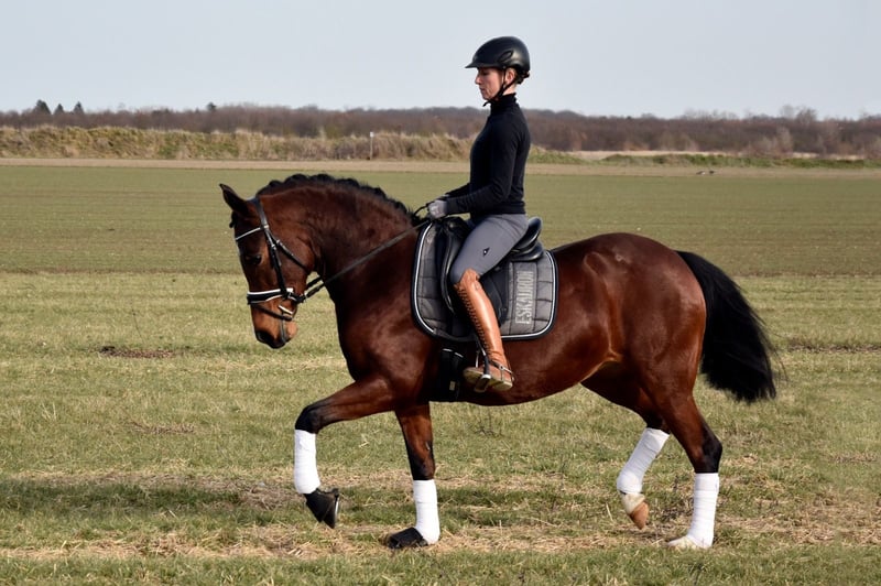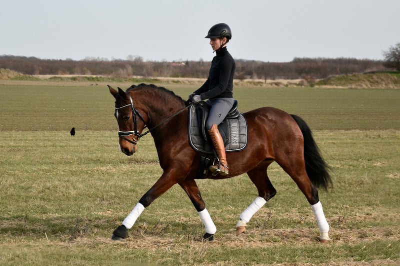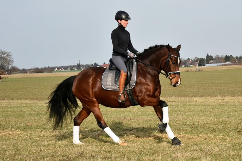 This 5-year-old German Riding Pony mare is truly a treasure. She is incredibly people-oriented and simply loves to be groomed and petted. Thanks to her very balanced nature and strong nerves, she will make a wonderful partner for the whole family with further training and development. As she leans more towards a stallion type, she also suits smaller adult riders well. The mare was gently backed at the beginning of her 4th year and then spent another summer on the pasture. Since the end of last year, she has been back under saddle and consistently demonstrates a calm demeanor while remaining very eager to learn and work. She has three good basic gaits and always strives to do her best. She is farrier- and loading-friendly and comes directly from the breeder.