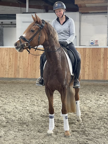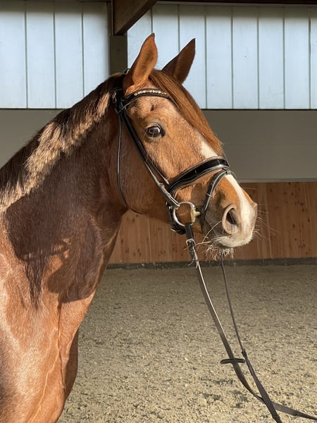 Diese 6 jährige Numero Uno Stute ist mit tollen GGA ausgestattet. Sie ist ganz charmant und ehrlich. Nach Zuchteinsatz erst kurz unter dem Sattel meistert sie ihre Aufgaben beeindruckend. Unerschrocken, leistungsbereit und sehr brav wächst hier ein tolles Dressurjuwel. Bei entsprechender Förderung gut vorstellbar im Dressurviereck mit Klein und Gross. Ältere Röntgenbilder ohne Befund vorhanden. Aktuelle Größe: 1,55m, noch in der Entwicklung stehend barfuß 8 Wochen unter dem Sattel, daher kein Anfängerpferd - Jungpferdeerfahrung wäre wünschenswert