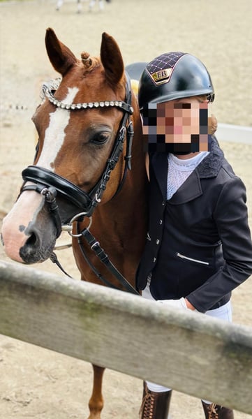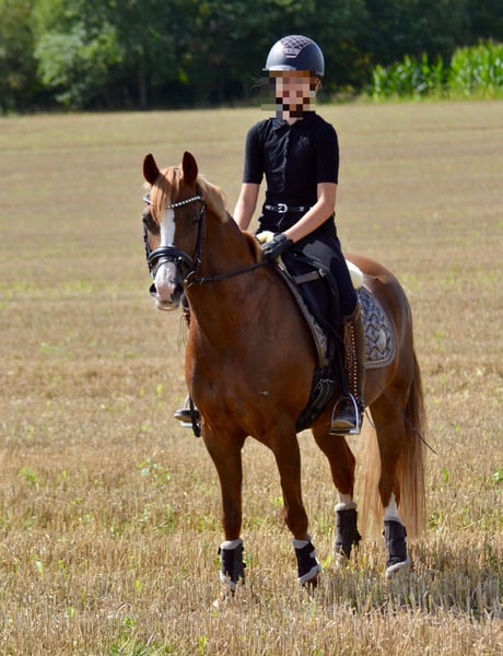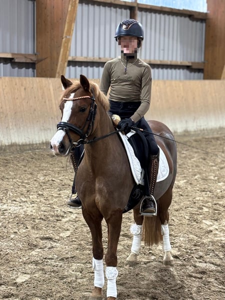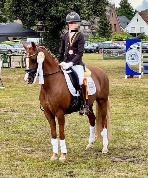 Wir verkaufen schweren Herzens unsere 8-jährige deutsche Reitponystute von Dance Star AT, da unsere Tochter leider zu groß geworden ist. „Fienchen“ ist brav und zuverlässig im Umgang. Sie wurde erfolgreich von der Führzügelklasse bis zur Klasse E (Dressur) vorgestellt und hat unserer Tochter zahlreiche Schleifen geschenkt . Sie zeigt sich stets motiviert - egal ob in der Halle, auf dem Reitplatz, auf dem Turnier oder im Gelände. Sie eignet sich ideal als Kinderpony für den ambitionierten Nachwuchs oder als Freizeitpony für die ganze Familie. Schmiede- und verladefromm, regelmäßig geimpft und entwurmt. Abgabe nur in beste Hände. Kein Verkauf an Händler oder Schulbetriebe. Bei Interesse oder weiteren Fragen bitte telefonisch melden. 0160 96460876