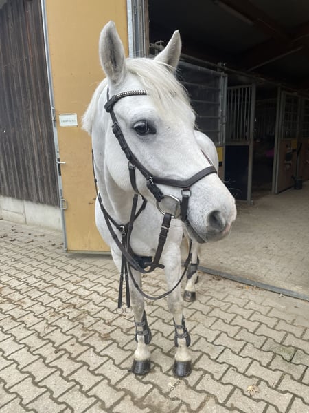 With a heavy heart, we are selling our pony mare Malissa due to switching to a full-sized horse. Malissa is a true pony diva, always eager and highly motivated. She has been successful in show jumping up to A** level, facing increasing challenges with enthusiasm. She has competed multiple times as a candidate pony at the Bavarian State Pony Championships and has participated twice in the South German Pony Championships. Malissa is excellent in handling, very affectionate, and loves cuddling. Of course, she is farrier- and loading-trainable. She also enjoys hacking, whether alone or in a group. We are looking for an absolute 5-star home so that Malissa can bring as much joy to a young rider as she has brought to us. Due to her motivation, she is not suitable for absolute beginners. Please contact us for more information if interested.
