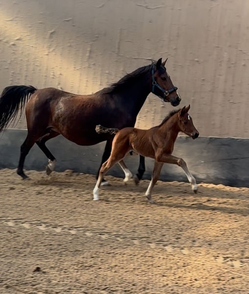**Sales Advertisement: German Riding Pony Stallion** For sale is a promising German Riding Pony stallion, born in 2025. He presents himself in a beautiful, elegant bay and impresses with his harmonious stature and friendly disposition. This stallion is ideal for sport or breeding and already shows promising approaches in his movement pattern. He is well-socialized, familiar with handling other horses, and has already gained initial experiences in various environments. His movements are smooth and expressive, making him a real eye-catcher. If you are looking for a talented and affectionate partner for sport/breeding, then this stallion is just right for you! If you are interested or have further questions, please feel free to contact me.