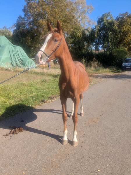 Zum Verkauf steht ein vielversprechender Deutsches Reitpony Hengst (Araber-Mix), geboren im Jahr 2024. Mit einem Stockmaß von 142 cm und seiner auffälligen Fuchsfarbe ist er ein echter Blickfang. Dieser talentierte Hengst hatte großes Potenzial im Springen und eignet sich hervorragend für ambitionierte Reiter, die auf der Suche nach einem vielseitigen Partner sind. Er ist bestens sozialisiert. Sein freundliches Wesen und seine Lernbereitschaft machen ihn zu einem idealen Begleiter. Bei Interesse oder für weitere Informationen stehe ich gerne zur Verfügung. tel: +49 15252194659