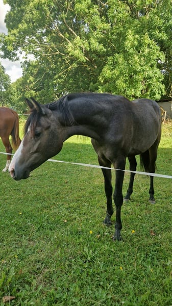 Cosmo Grey ist ein fast dreijähriger, wunderschöner und sportlich-moderner Reitpony-Hengst der ins Endmaß wachsen wird. Auch aufgrund seiner Abstammung, seiner 3 sehr guten GGA, der hervorragenden Leistungsbereitschaft und Lernfähigkeit hat er alle Chancen auf eine Sportkarriere oder Köraspirant zu werden und in den Zuchteinsatz zu gehen.Er ist bei uns geboren sowie liebevoll und artgerecht aufgewachsen. Cosmo hat eine außergewöhnliche Fellfarbe, zur Zeit dunkelbraun -stichelhaarig, kann aber dunkler Schimmel werden. Er kennt Bodenarbeit,Trense,Longe und ist auch beim Schmied und Hänger fahren artig. Er ist selbstverständlich regelmäßig entwurmt und geimpft.