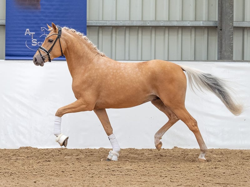 Hoch interessanter Sohn des Dancing Snowflake. Anlässlich der Körung 2025 des Pferdestammbuch Weser-Ems konnte der Typstarke Palomino den Körplatz in Vechta als Prämienhengst verlassen. Mit seinen 145 cm Stockmaß ist er ein Pony im mittleren Rahmen. Altersentsprechend anlongiert, ist er bereit für neue Herausforderungen. Es stehen noch weitere Youngster zum Verkauf, kontaktieren Sie uns gerne unter 01733591423.
