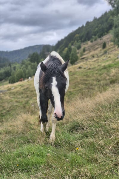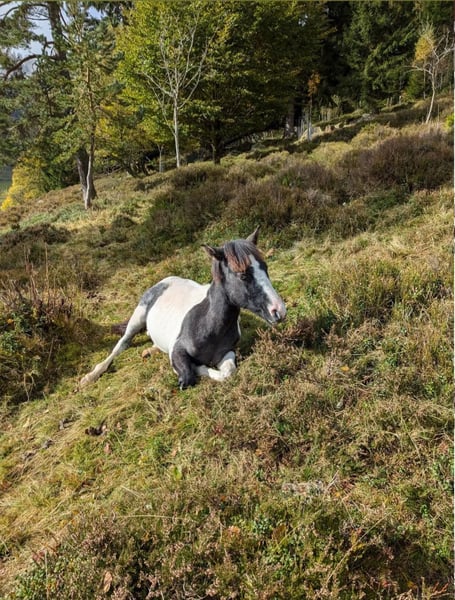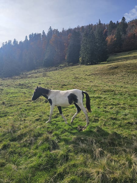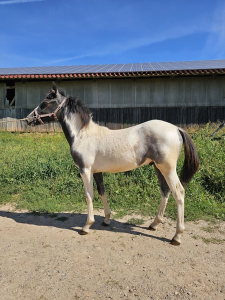 Very calm and kind stallion with a blue eye. Silver spotted. Suitable for leisure riders. Family horse. Grows up healthy on our large Black Forest pastures, in a herd. - Sturdy build - Easy to handle - Approved - Papers ZfdP Mother: Bella (Pony without pedigree) Father: Ben Hour (Lewitzer mix, see stallion advertisement) **Entering the yard and pastures of the establishment for viewings and riding of sale horses is always at your own risk! Exclusion of any warranty! For trial riding of our sale horses, we charge €50. This amount will be deducted from the purchase price of a horse.**