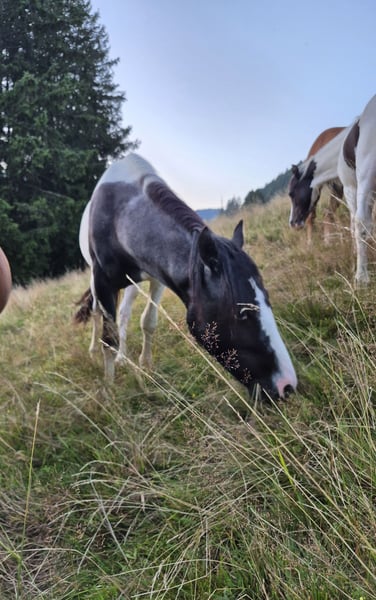 Bardzo spokojny i miły ogier z niebieskim okiem. Srebrny srokacz. Nadaje się dla jeźdźca rekreacyjnego. Koń rodzinny. Rośnie zdrowo na naszych dużych łąkach w Schwarzwaldzie, w stadzie. - stabilna budowa - łatwy w obsłudze - ogier z certyfikatem - dokumenty ZfdP Matka: Bella (kuc bez pochodzenia) Ojciec: Ben Hour (mix Lewitzera, patrz ogłoszenie o ogierach do krycia) **Wstęp na teren gospodarstwa i łąki w celu oględzin oraz jazdy na koniach na sprzedaż odbywa się zawsze na własne ryzyko! Wyłączenie wszelkiej odpowiedzialności! Za jazdę próbną naszych koni na sprzedaż pobieramy 50€. Kwota ta zostanie odliczona przy zakupie konia.**