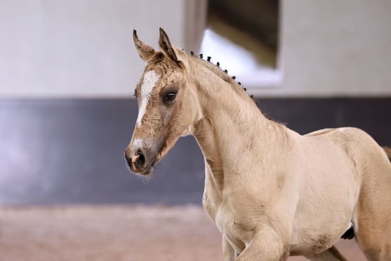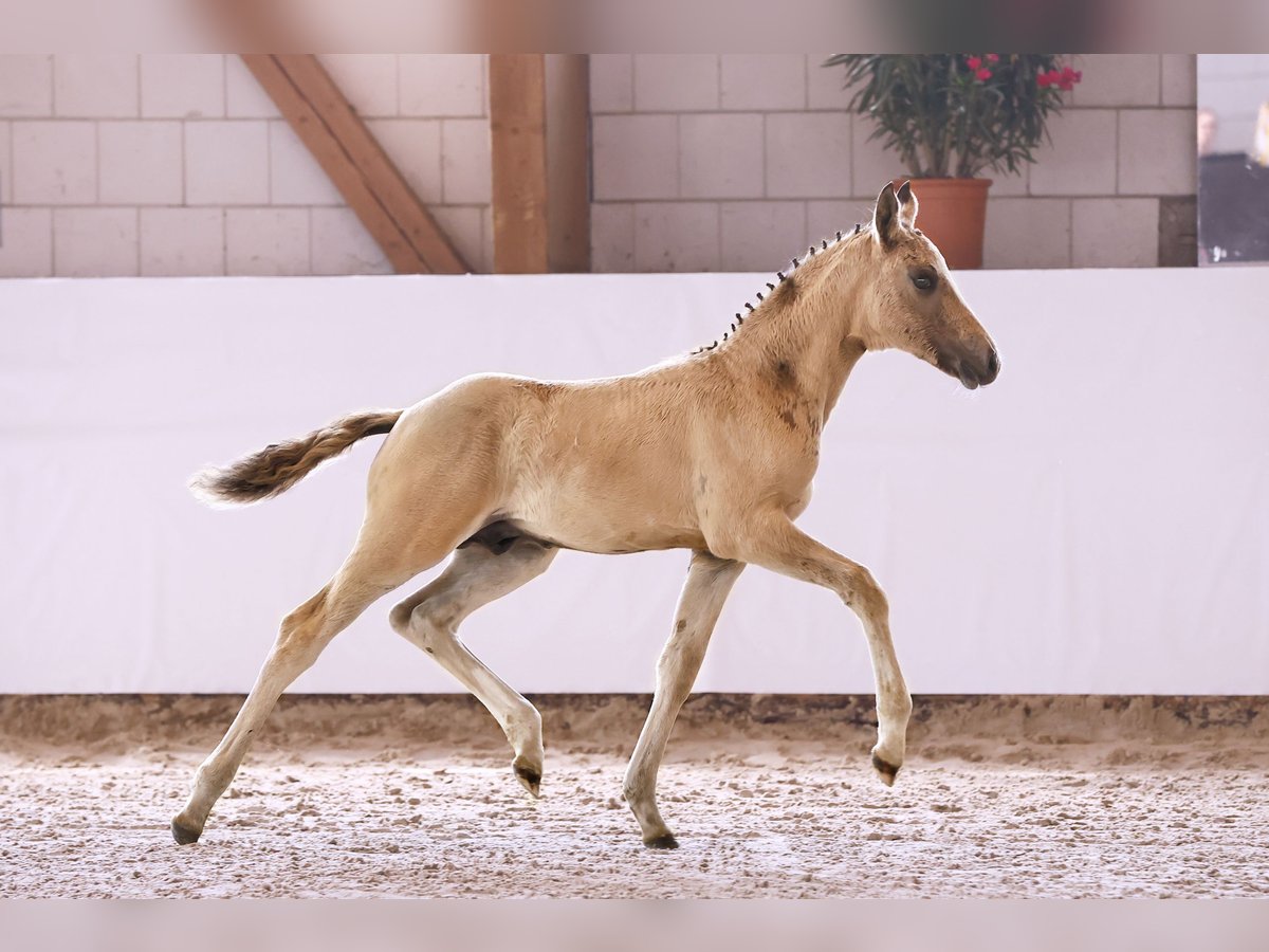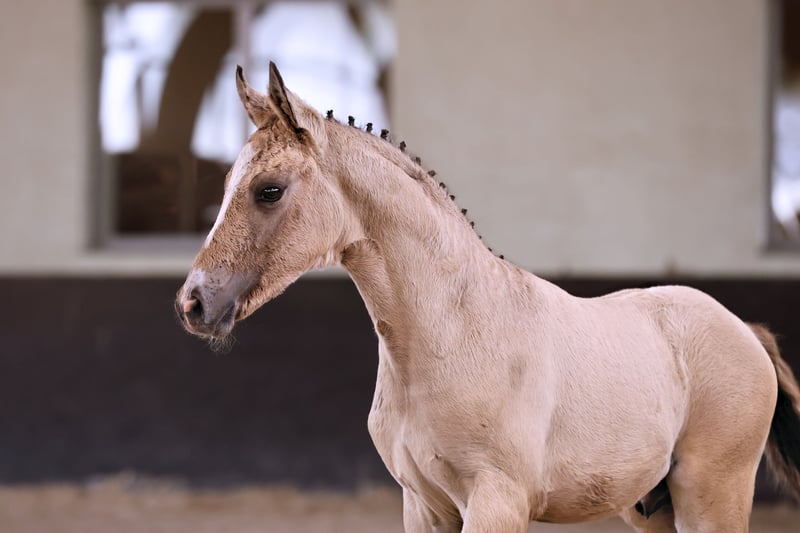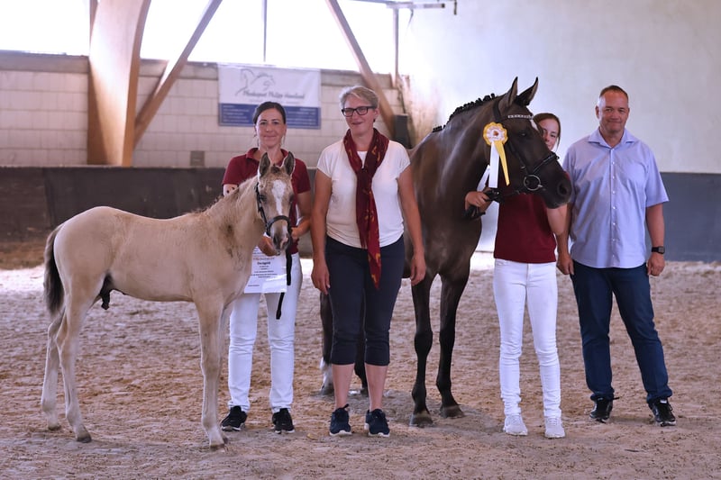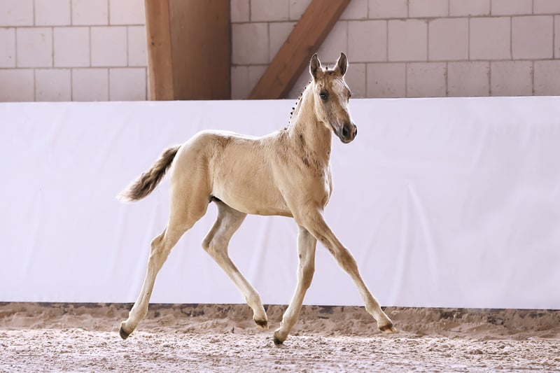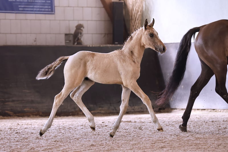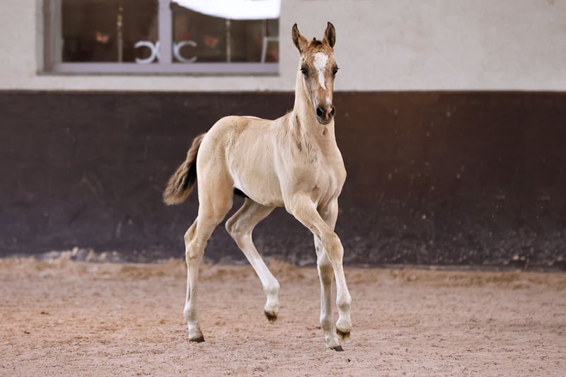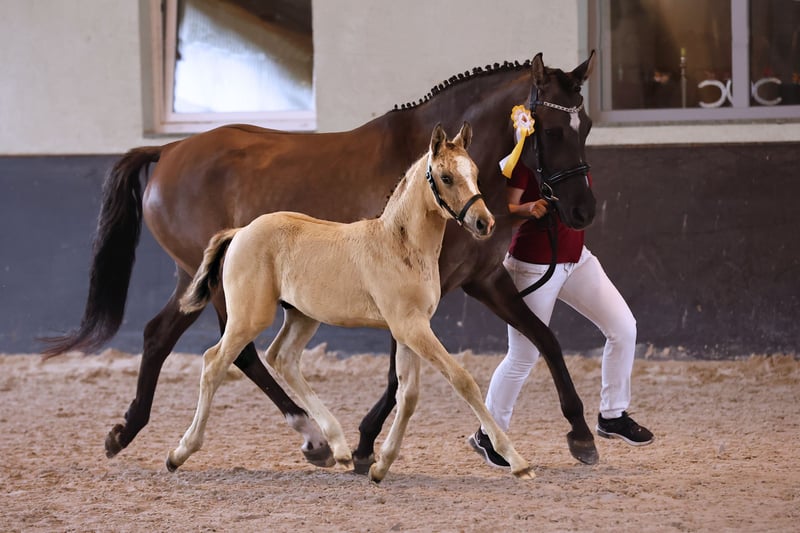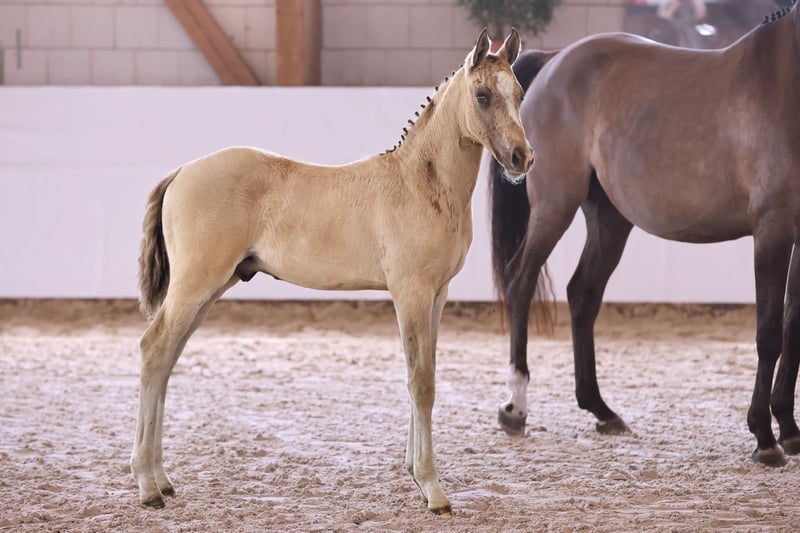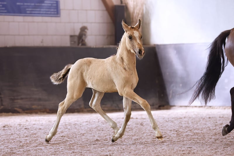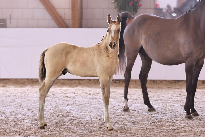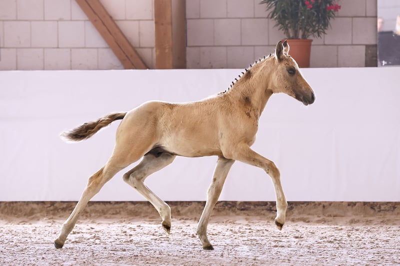 Name: Galant NL Born on: 12.05.2024 Stallion, black dun champagne, championship foal Price on request Father: Gold Design Dam: Friedrichshof Donnerlittchen MV: Kastanienhof Donnertrommler "Galant NL" is highly interesting in terms of color and genetics. A stallion is growing up here to whom all areas of the sport are open. He has very good basic gaits and will probably reach his final size. His appearance makes hearts beat faster. Absolutely likeable, easy to lead with a halter, easy to load and to have farriered and regularly wormed. So the foal ABC is no problem at all. Based on the rideability and willingness to perform of his parents and grandparents, you can already look forward to when he is old enough to work. Directly from the breeder, he has so far grown up in the foal association. He will soon be weaned and can find his new owners. If required, he can also stay with us for rearing. We have a herd of stallions, so this would not be a problem.